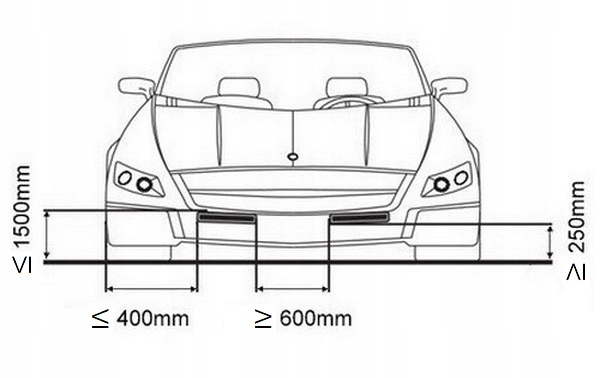 Светильники необходимо устанавливать комплектом симметрично на высоте мин. 250 мм, макс. 1500 мм, не далее 400 мм от боковой кромки автомобиля, при этом расстояние между фарами должно быть мин. 600 мм.