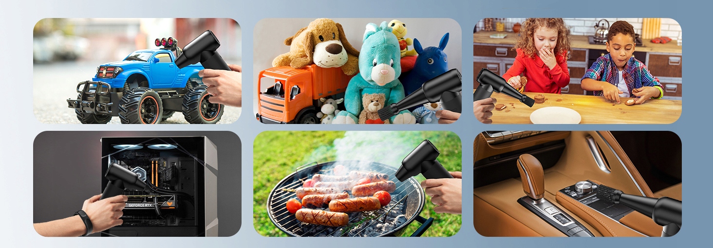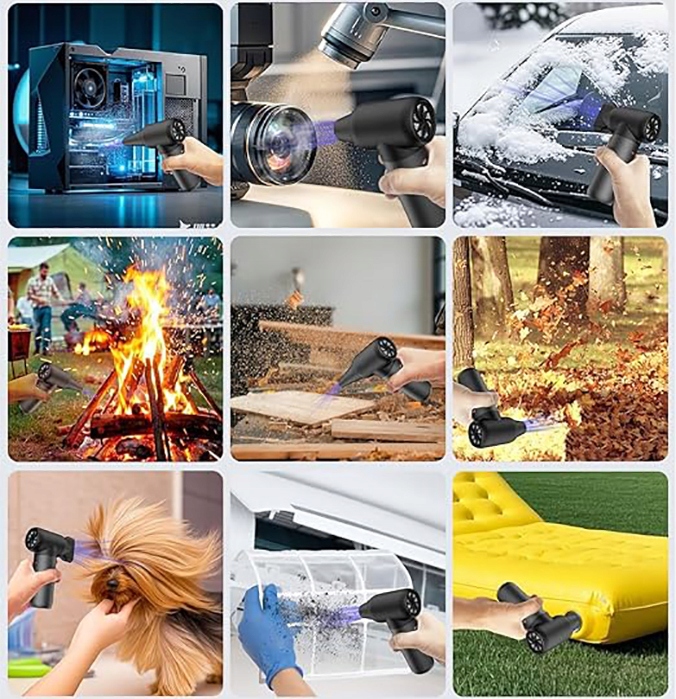для удаления пыли с компьютеров и клавиатур, освещения сердец и листьев снаружи, сушки для человека и животных, удаления снега из автомобилей, раздувания воздушных матрасов, воздушных шаров и не только.