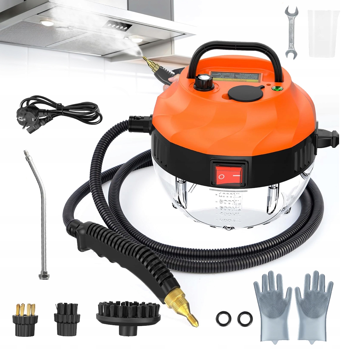 Оснащен большой круглой кистью, проводной щеткой, чистящей щеткой, металлическим удлинителем и латунным сопло, подходящим для очистки больших поверхностей, таких как стены, столешницы и кухонные капюшоны. Он также подходит для металлических поверхностей, таких как печи, горшки и раковины, а также для игрушек, мебели, стекла и плиток.