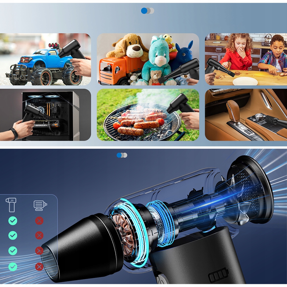 - ✔ Очистка воздушного вакуума оснащена большой батареей 6000 мАч с тремя регулируемыми настройками скорости.