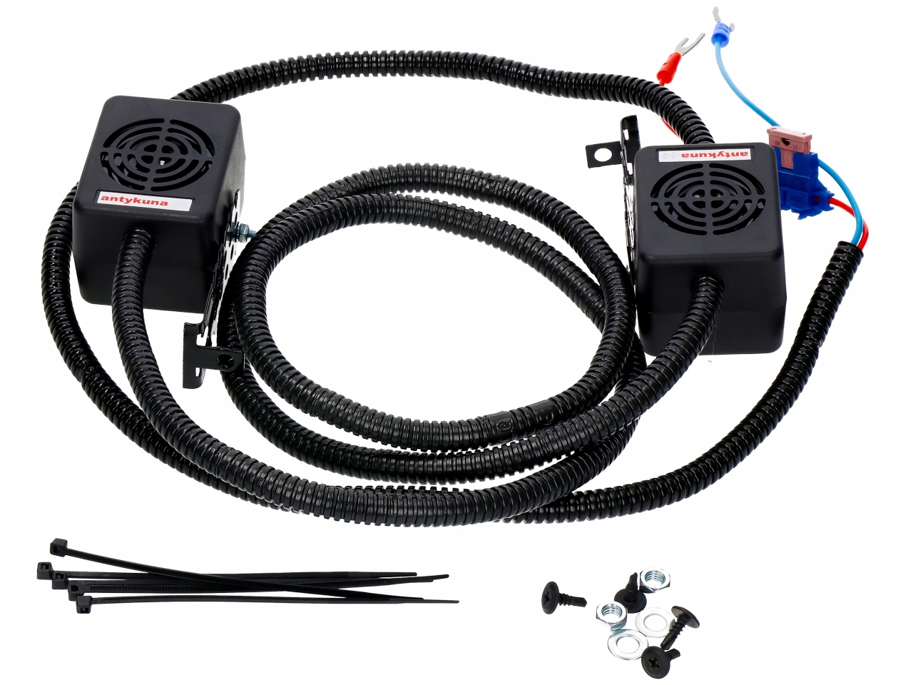 Отпугиватель куниц двойной, комбинированный Extra Strong для автомобиля «Антыкуна» был произведен в Польше. В комплект входят все необходимые элементы для установки отпугивателя в автомобиль.
