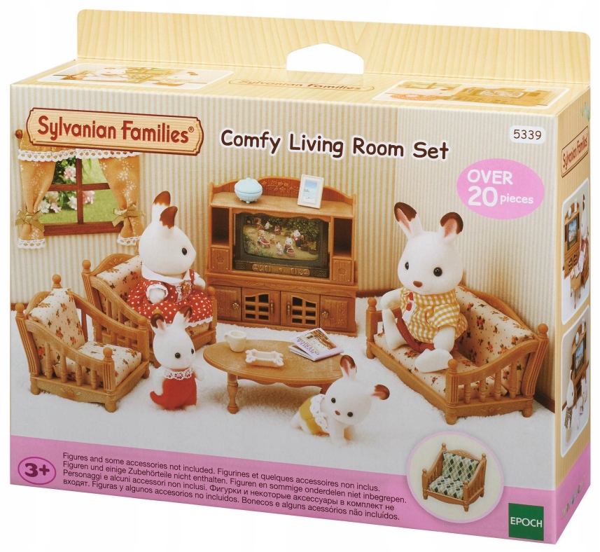 Гостиная Sylvanian Families, оформленная в стиле кантри, позволит вам обустроить уютную комнату в любом кукольном домике. Вся семья сможет расположиться на двух креслах и диване и провести приятные минуты перед телевизором. Стол и подставку под телевизор можно декорировать, а изображения на телевизоре взаимозаменяемы. Комплект мебели состоит из более чем 20 элементов и включает в себя тумбу под телевизор со сменными картинками, два кресла, диван, стол и другие аксессуары и украшения. Набор мебели предназначен для детей от 3-х лет.