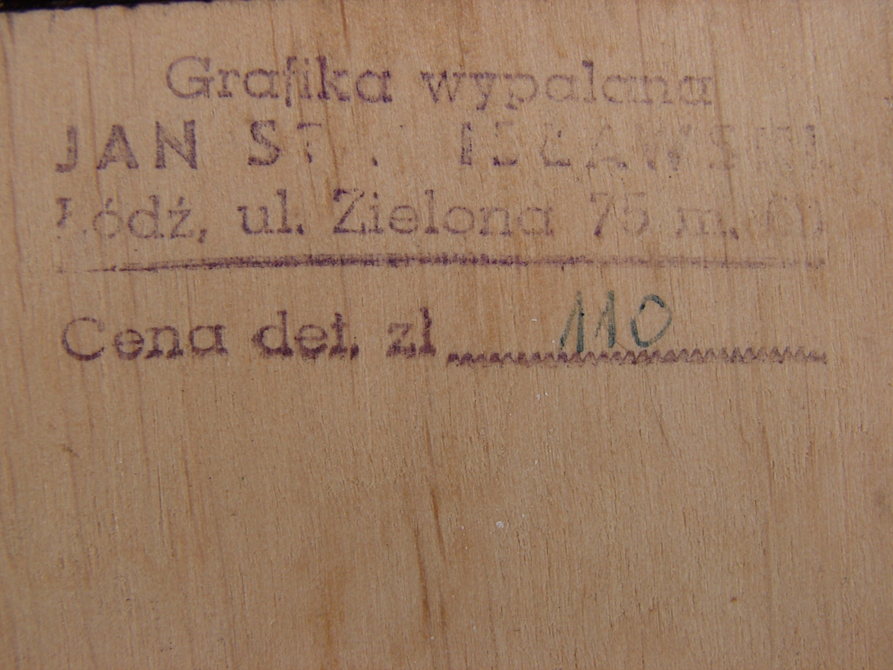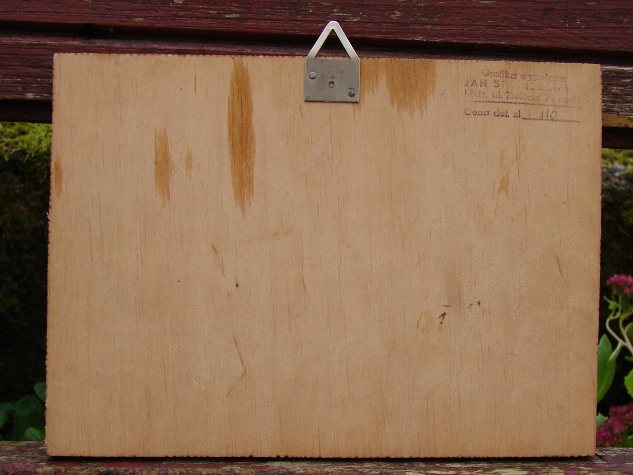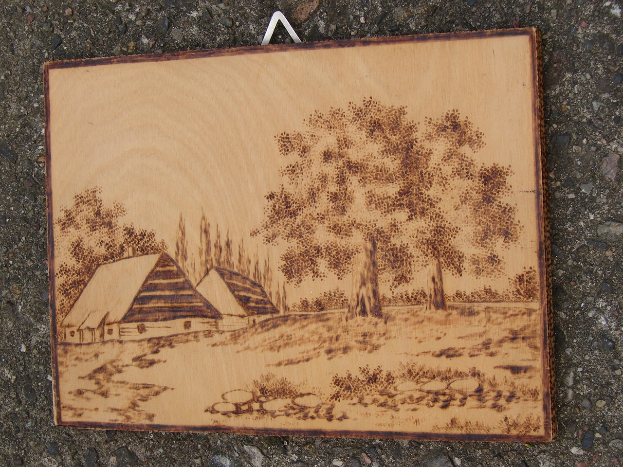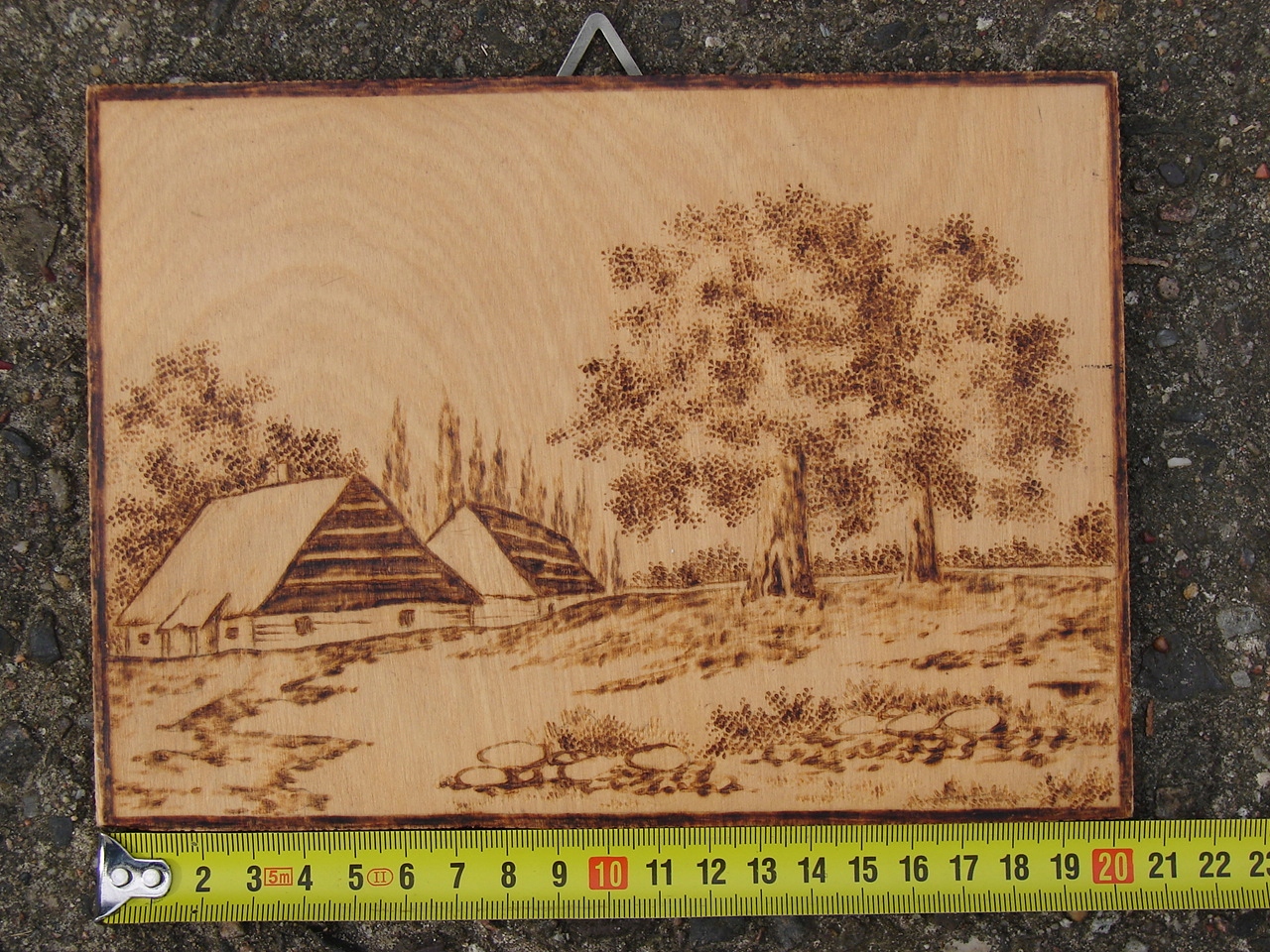 Сільський пейзаж, ручна випалена графіка на дереві часів ПНР