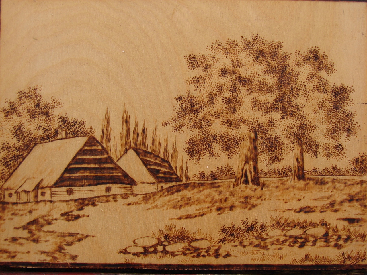 Графика - сельский пейзаж, выполненный методом выжигания на доске.