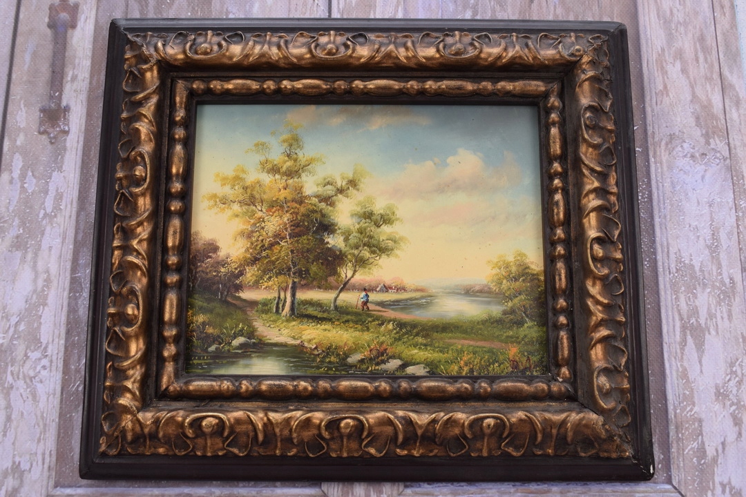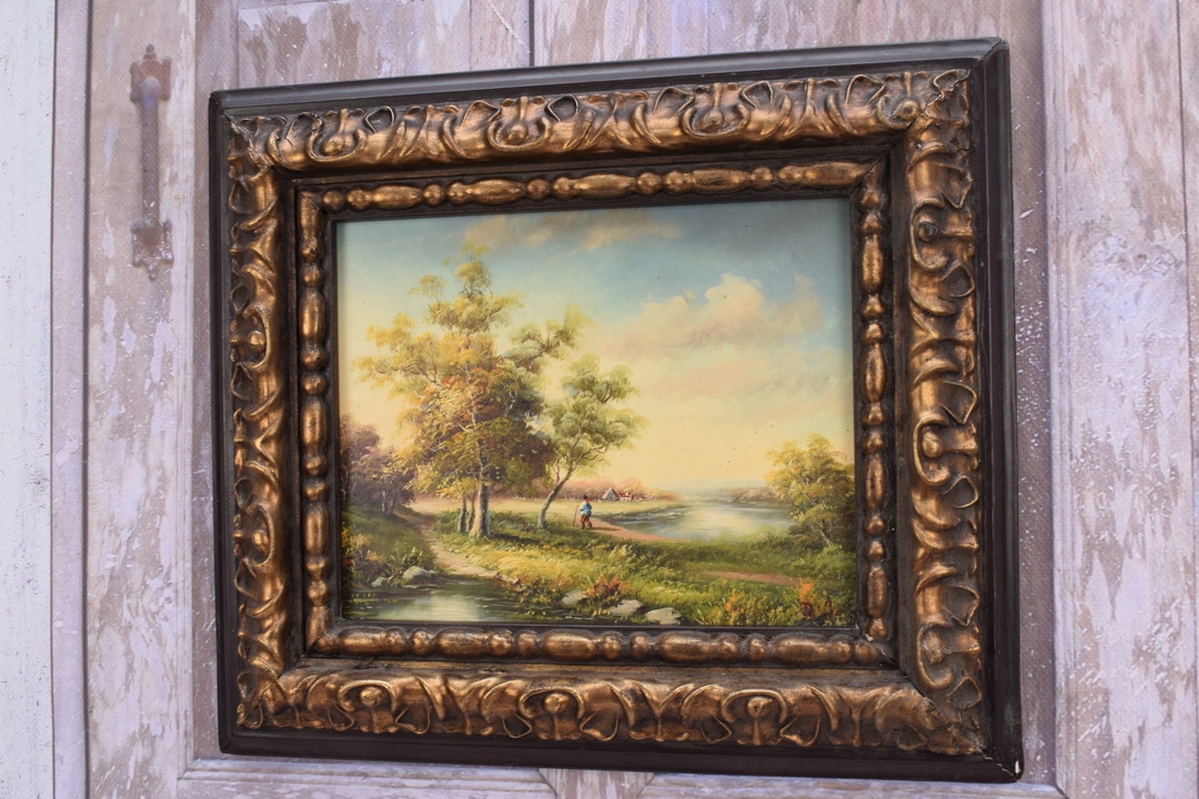Сільський пейзаж Дерева Річка - чудова картина маслом - чорно-золота рамка
