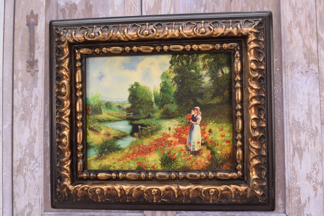 Сільський пейзаж жінка з квітами чудовий олійного живопису чорно-золотий кадр