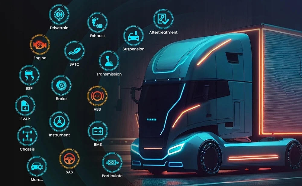 Диагностика ВСЕХ систем позволяет считывать и удалять коды DTC, текущие данные и информацию ЭБУ для всех систем дизельных грузовиков, включая: