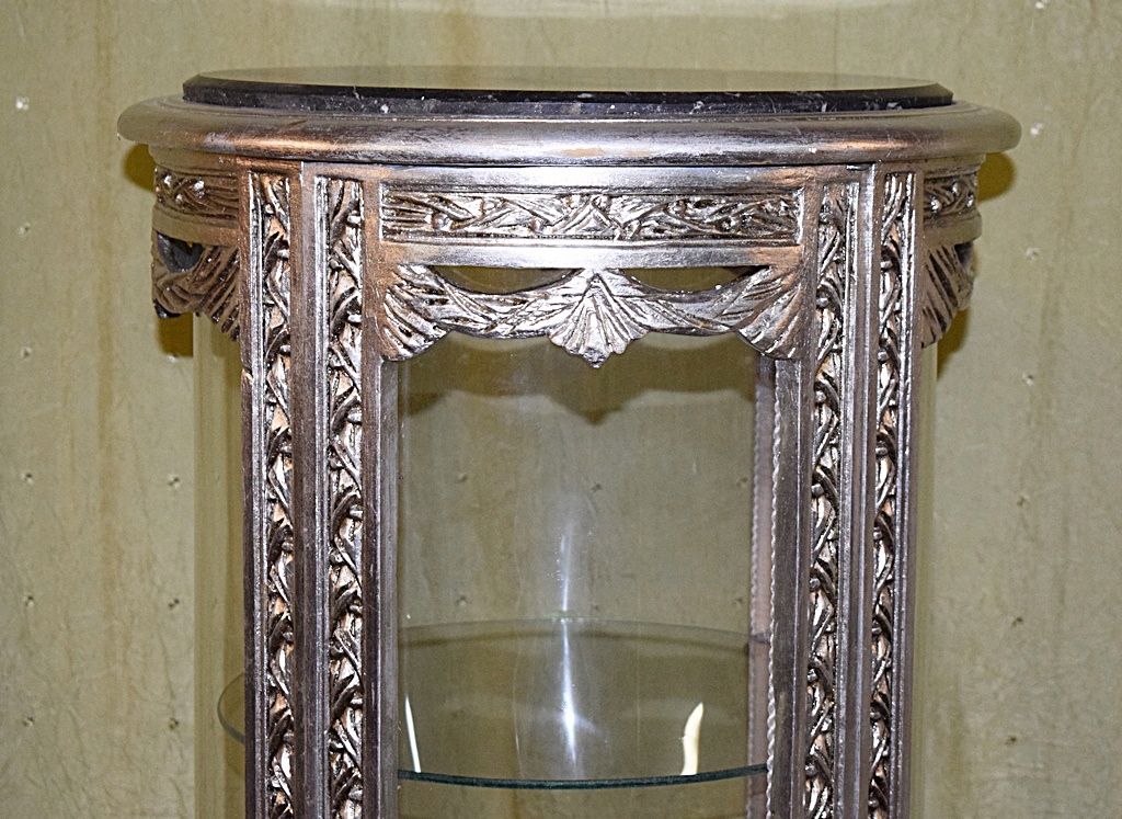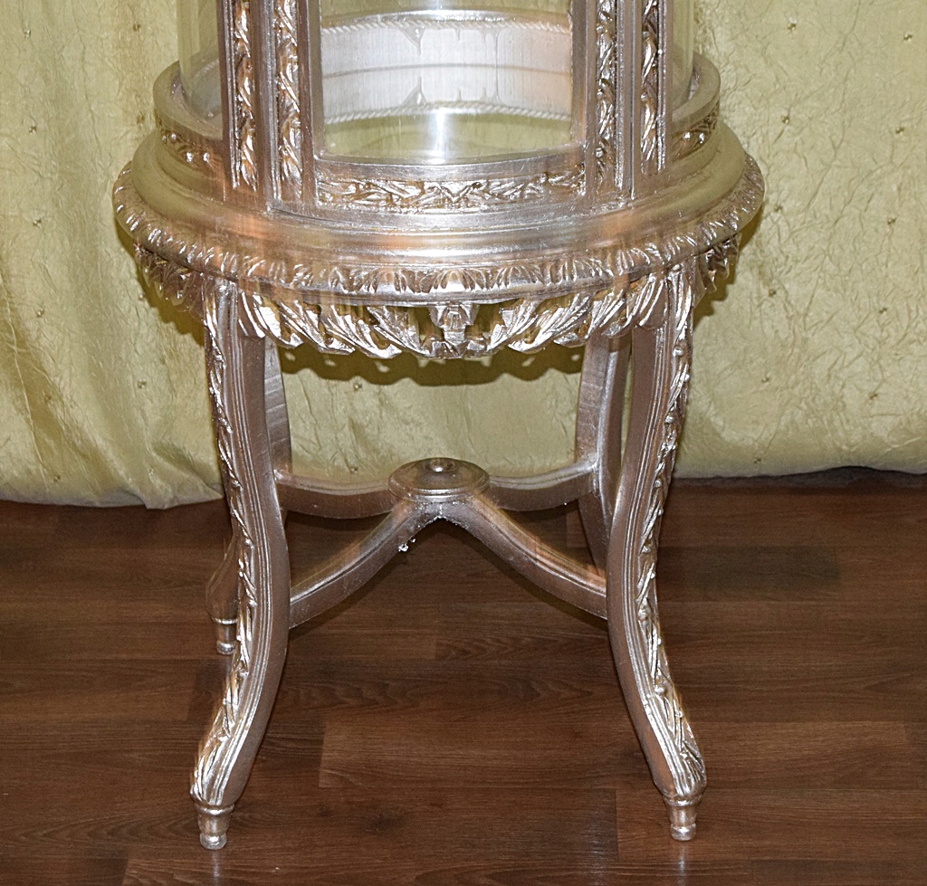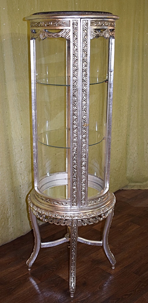 Этот предмет мебели выполнен в современном стиле, сохраняя при этом старый дизайн и стиль. Имеет две стеклянные полки и зеркальное дно. Он застеклен со всех сторон и увенчан практичной столешницей из черного мрамора. Прекрасные ажурные скульптуры, цвет дерева античное серебро, придающий витрине изящность и легкость на высоких ножках.