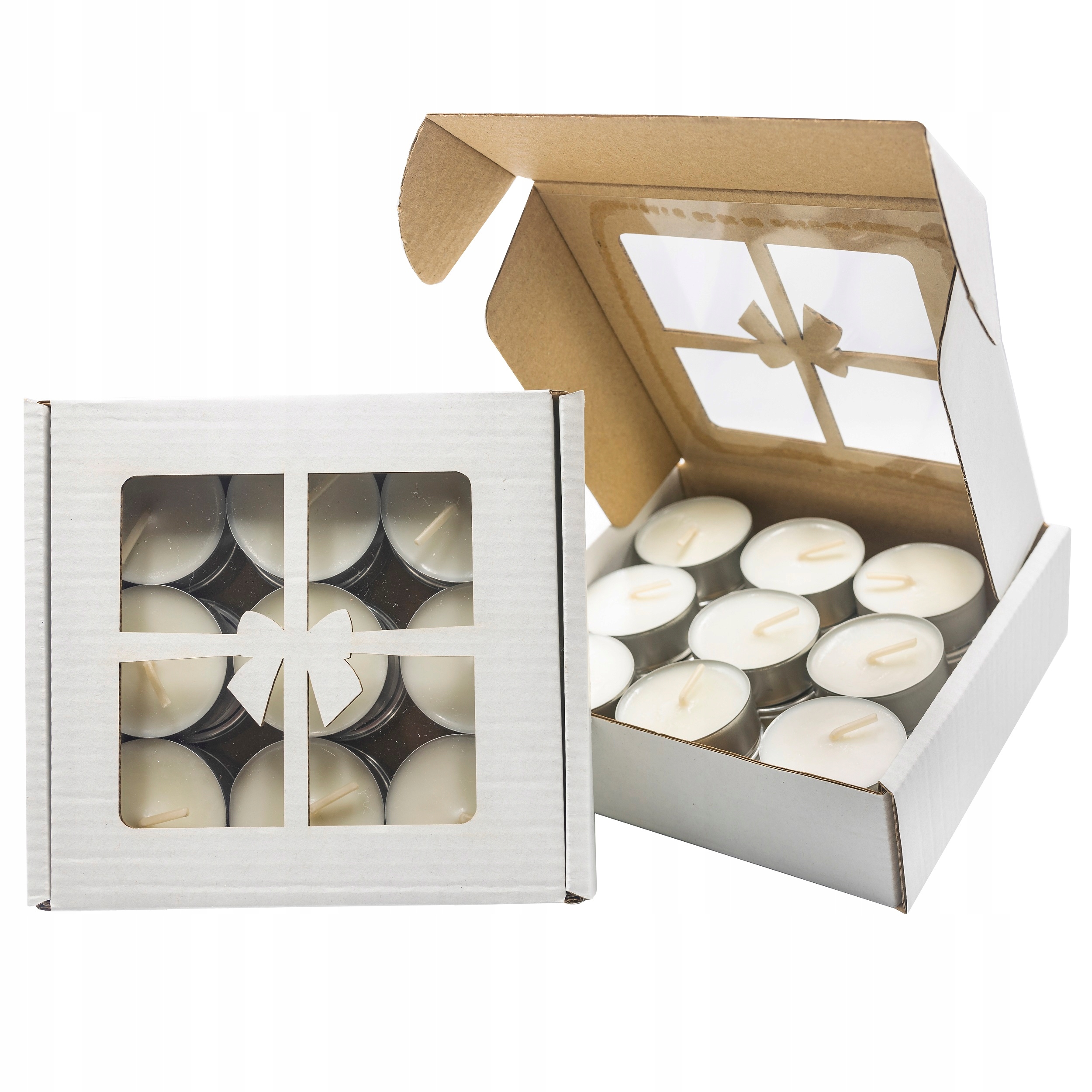 Для ароматических восков рекомендуем набор чайных свечей, которые также упакованы в подарочную коробку с дугообразным окошком.