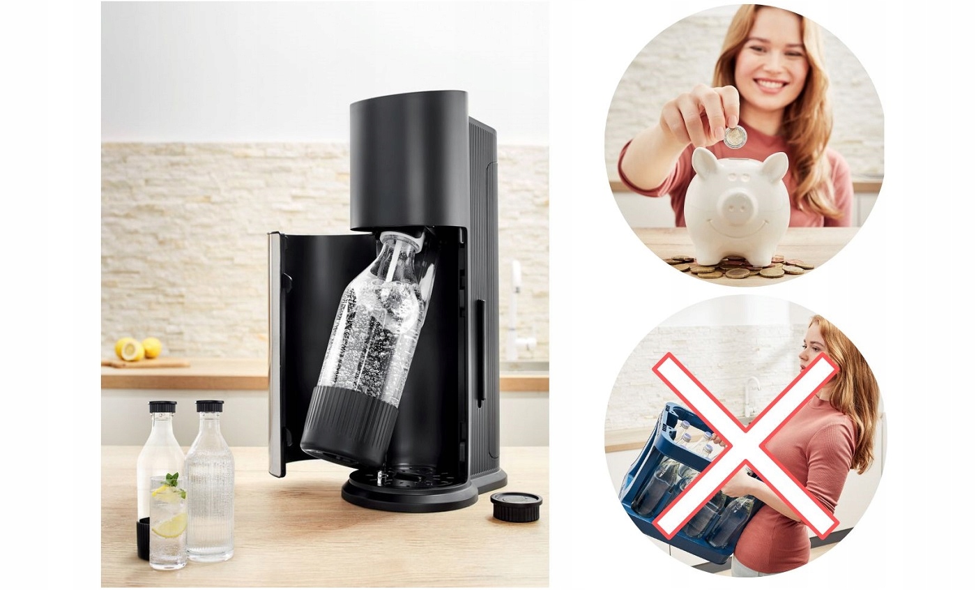 Простая работа устройства позволяет эргономически изогнутую и складывающуюся держатель бутылок b>. Производство водой натрия начинается после нажатия кнопки, и саника независимо распределяет содержание углекислоты. Чтобы использовать устройство, этого достаточно: