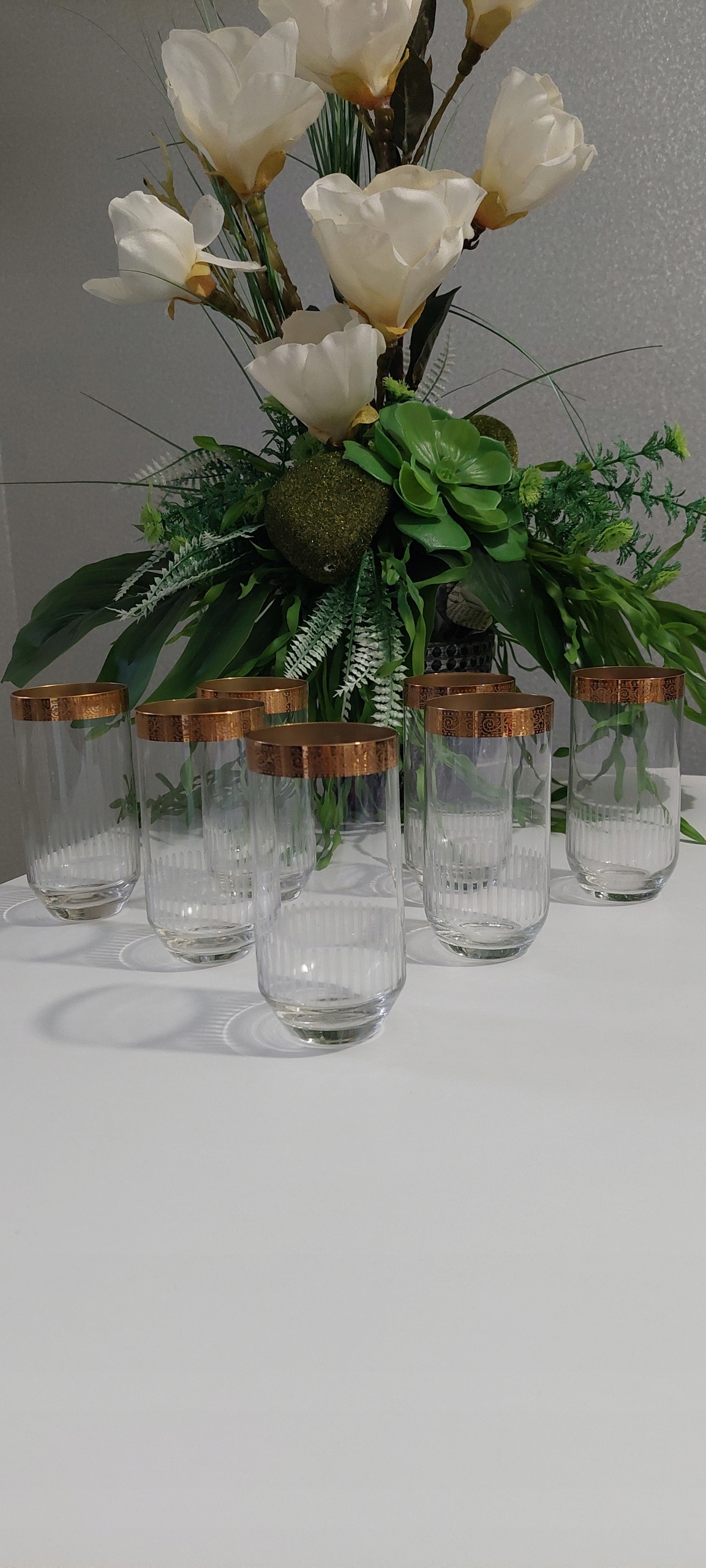 Семь очков в очень хорошем состоянии богато позолоченное, прикованное стекло с высотой размеров 12 см, диаметр инфузии 6 см.