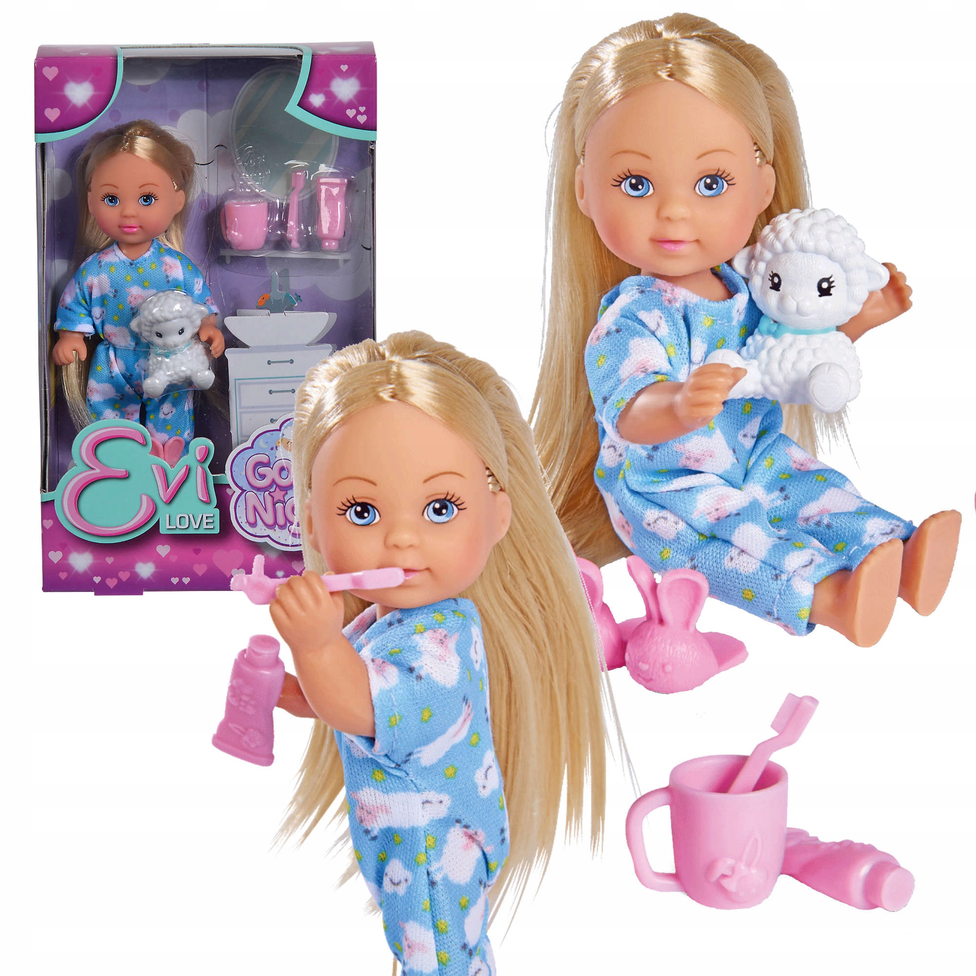 У Эви длинные светлые волосы, очаровательная пижама с овцами и облаками и тапочки в виде кролика. белая овца помогает ей заснуть. Прежде чем заснуть, Эви не забывает почистить зубы, используя входящие в комплект щетку, зубную пасту и чашку.