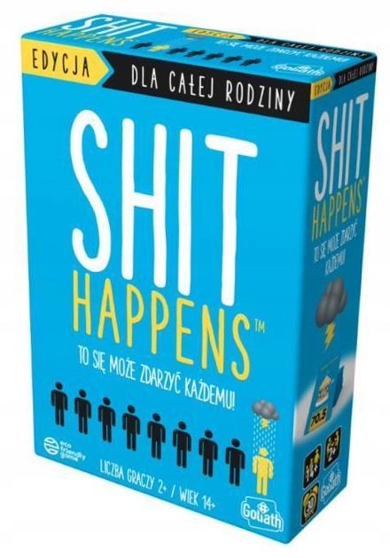 SHIT HAPPENS GAME — Семейное издание Жизнь — это извилистая дорога, вымощенная жалкими ситуациями, с которыми мы сталкиваемся, когда меньше всего их ожидаем... так что давайте попробуем над ними посмеяться! В семейной версии присутствуют карточки с менее спорными ситуациями! Возраст 14+ Shit Happens — игра, в которой на картах изображены по-настоящему запутанные ситуации. Вашей задачей будет расположить их в правильном порядке, согласно специализированной шкале Гувнометра! Чтобы получить карту, угадайте ее рейтинг отчаяния! Тот, кто соберет 10 карточек, станет победителем! Что такое Гуунометр? Это виртуальная шкала от 0 до 100. Специалисты сказали, что 0 означает, что я ничего не чувствую, а 100 означает: Почему со мной это случилось??? на каждой карточке есть слоган на ПОЛЬСКОМ языке, иллюстрации, которые помогают нам представить ситуацию, индекс отчаяния, благодаря которому мы помещаем карту в нужное место на нашем Gównometer, комплектация: инструкция, 200 карточек