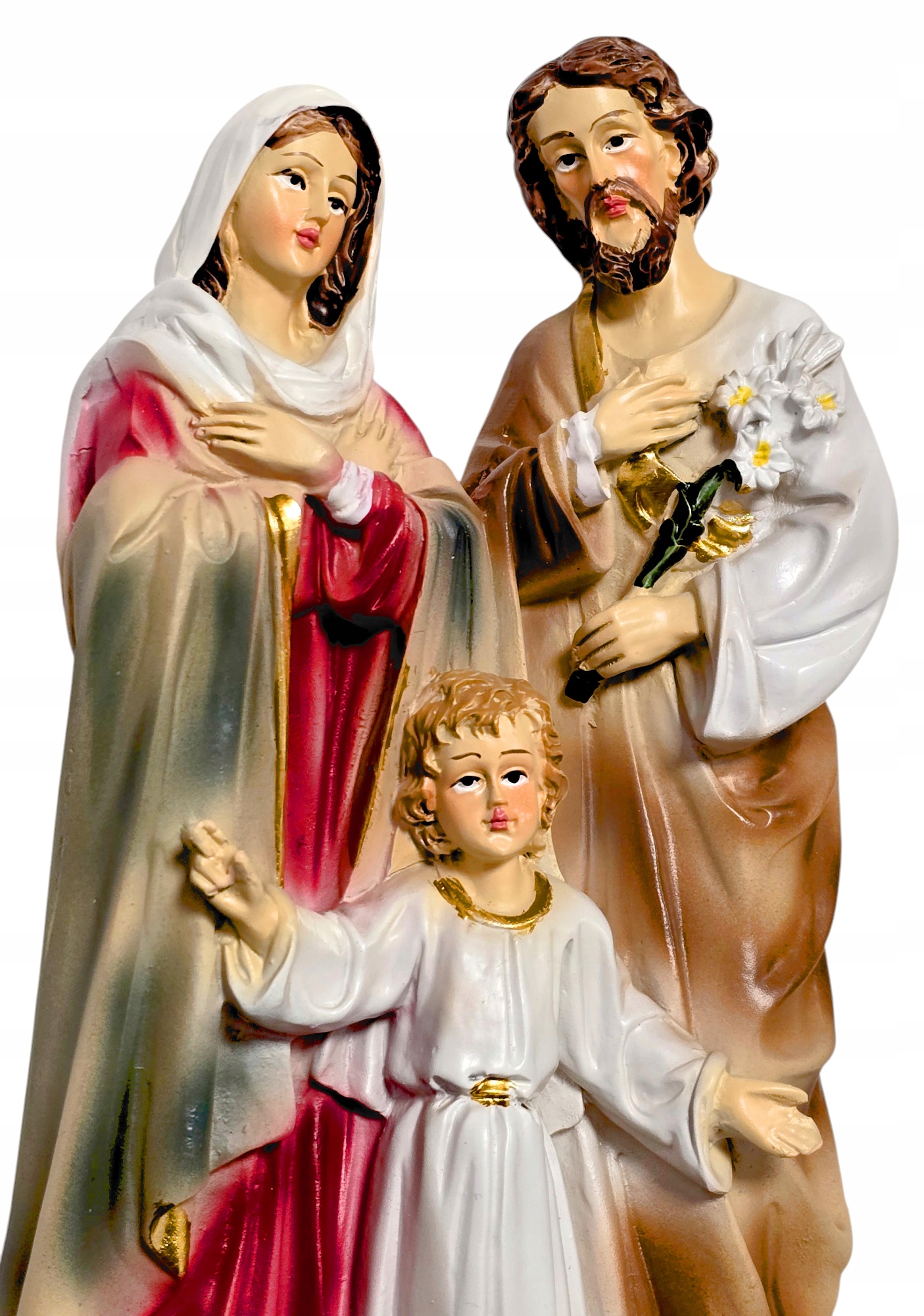 Откройте для себя глубину символики и тепло изображения семьи на этой очаровательной фигурке Святого Семейства. Иисус, с распростертыми объятиями и символическим расположением пальцев, напоминает о Его двойной природе. Мэри, сложив руки на сердце, выражает любовь и преданность. Святой Иосиф, держащий лилию, символизирует чистоту и заботу. Вся сцена, помещенная на платформу с надписью «Сакра Фамилия», излучает спокойствие и гармонию. Статуэтка высотой 22 см, сделанная из постоянной синтетической смолы, является уникальным декоративным и духовным элементом в каждом доме.