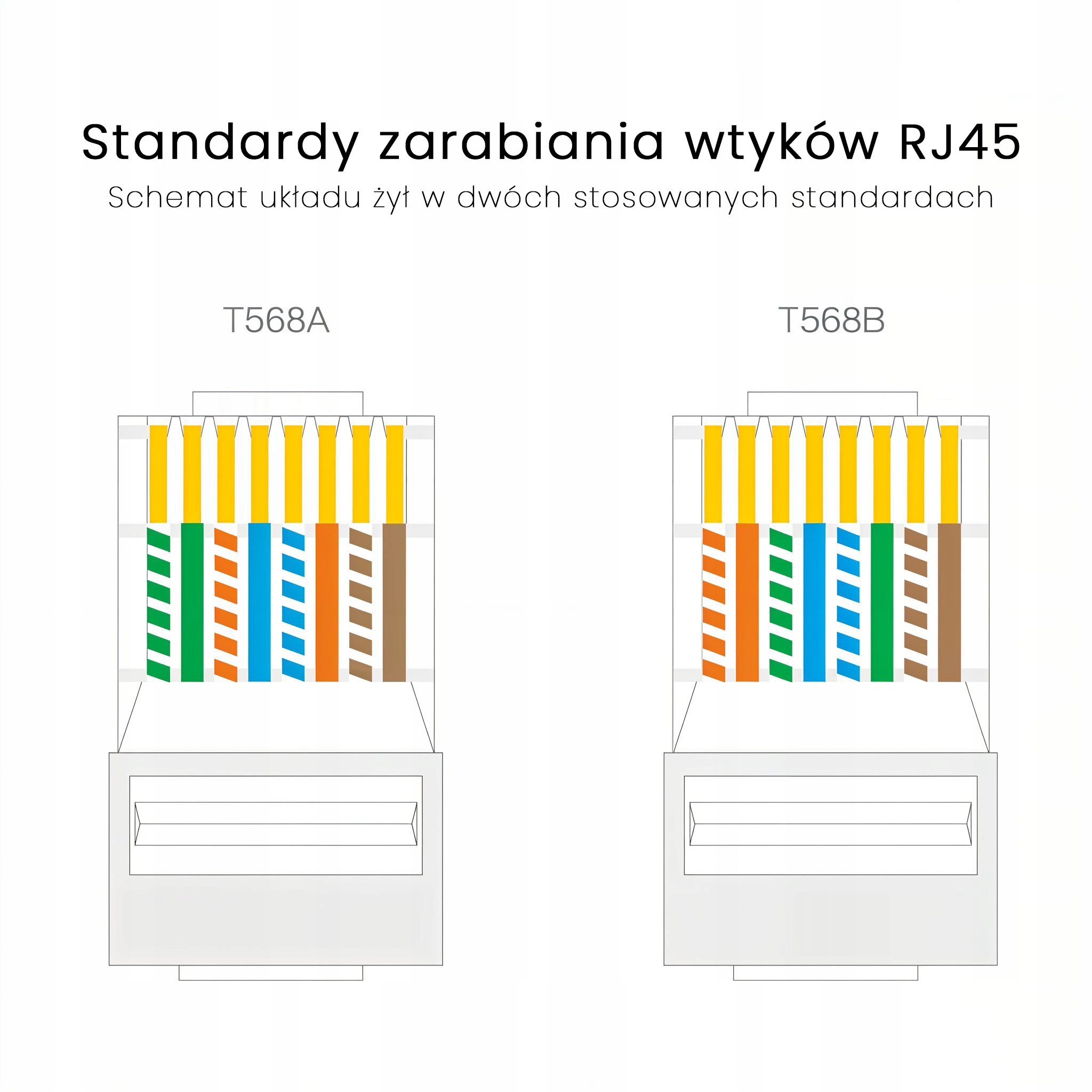 В структурной проводке локальной сети используются два основных стандарта заработка проводов в пробках 8p8c - t568a и t568b , которые определяют порядок укладки отдельных пар проводов. Оба решения соответствуют категориям сетевых кабелей и обеспечивают идентичные параметры передачи, поэтому они отличаются только по цвету цвета провода в гнезде и заглушке. Стандартный t568a чаще используется в домашних установках и в административных зданиях, в то время как t568b популярен в коммерческой и промышленной среде.