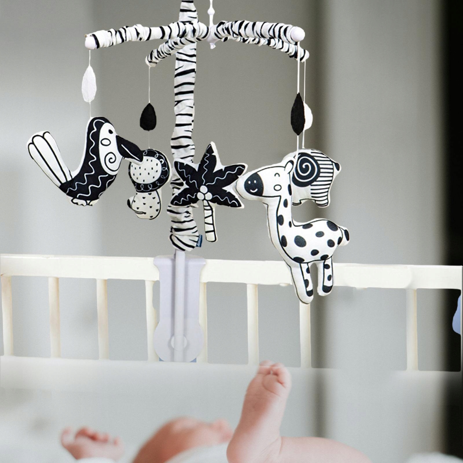 ВРАЩАЮЩИЙСЯ МУЗЫКАЛЬНЫЙ МОБИЛЬ: музыкальный мобиль для кроватки будет воспроизводить тихую музыку, а висящие погремушки медленно вращаются на 360 градусов, что может привлечь внимание.