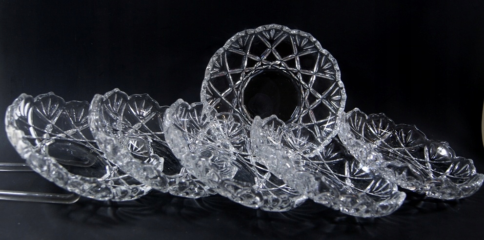 Тема аукциона представляет собой красивый набор десертных пластин 6 штук, сделанный из толстого бесцветного хрустального стекла.