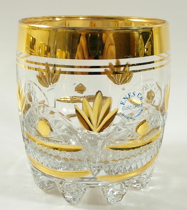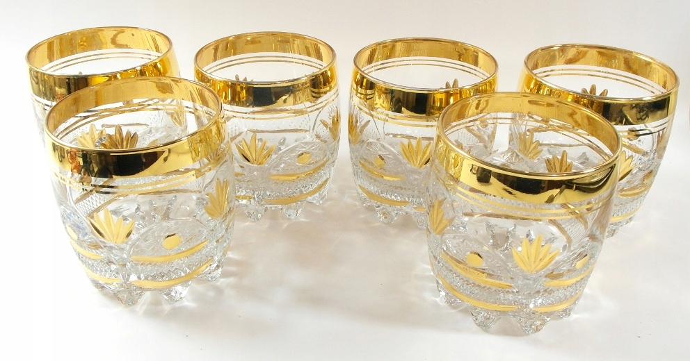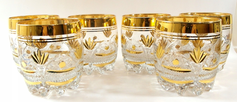 Красивые, старые, массивные очки- набор из 6 штук изготовлен из толстого бесцветного хрустального стекла, глубокого, позолоченного рисунка.