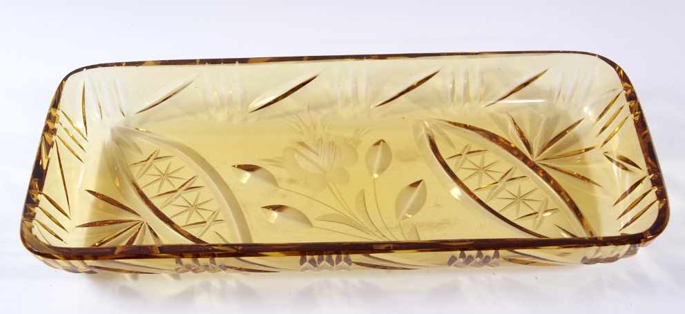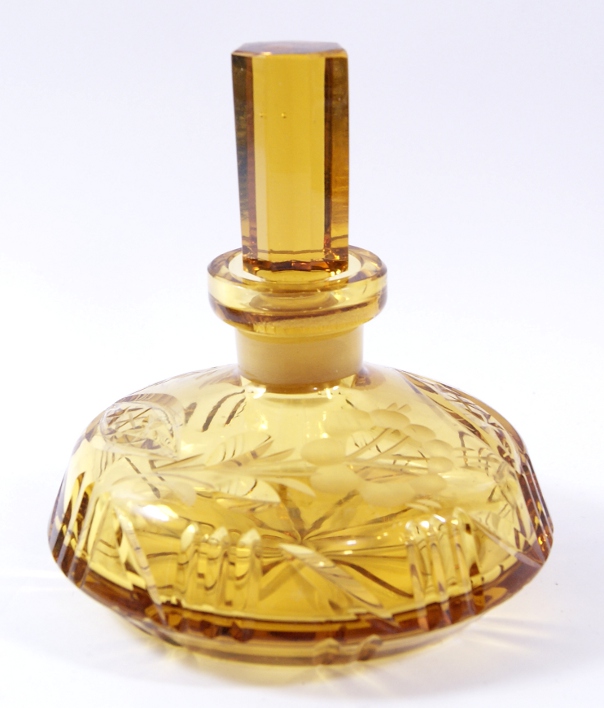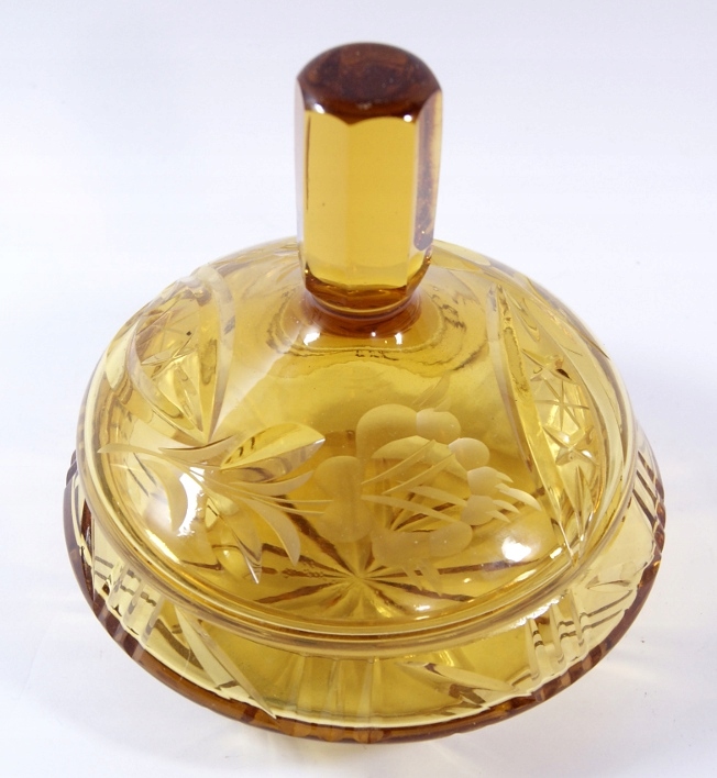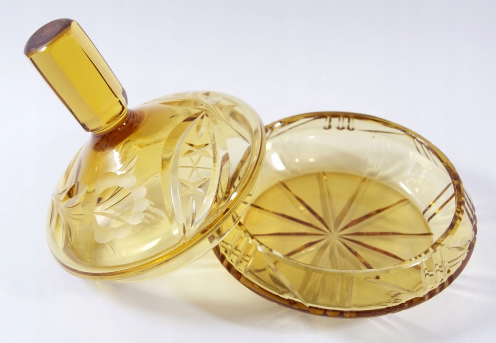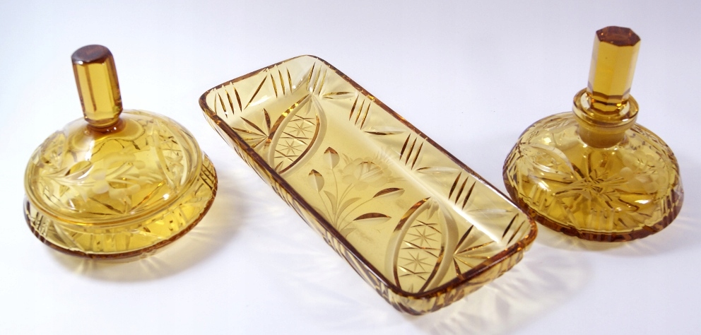 Красивый, старинный туалетный набор, выполнен из медового хрустального стекла, резной декор. В стекле периодически появляются пузырьки воздуха.