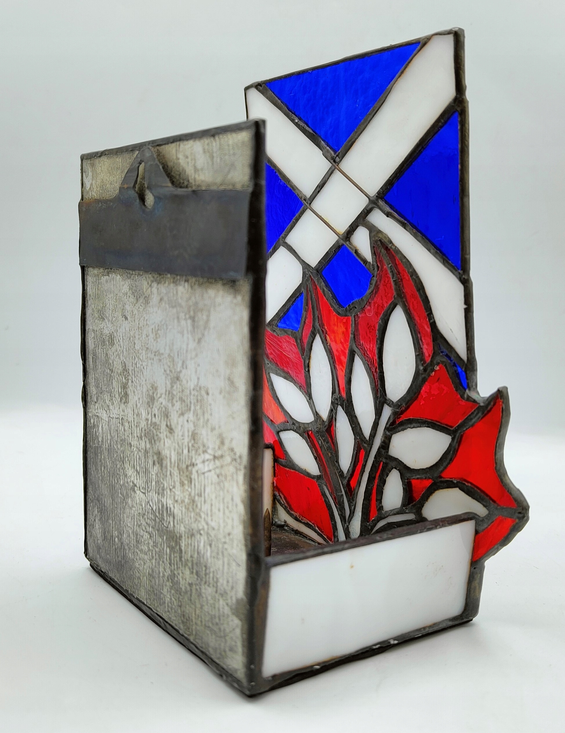 - подсвечник, изготовленный из окрашенного толстого стекла. Свинец/олово, отдых из листа, висящего в задней части, - это глаз/крюк,