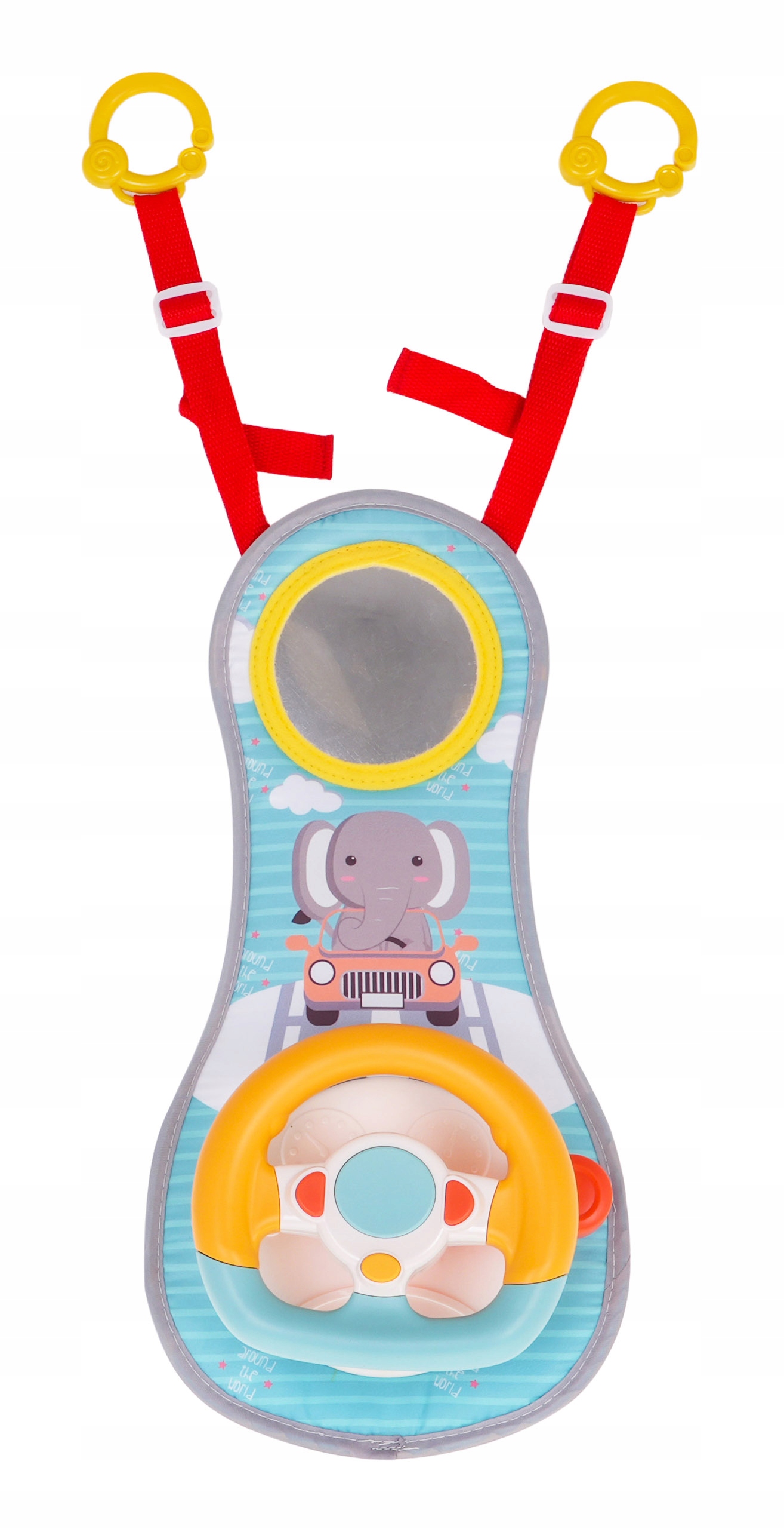 Комплект легко крепится к подголовнику сиденья. Игрушка стимулирует развитие чувств ребенка посредством звуков и света.