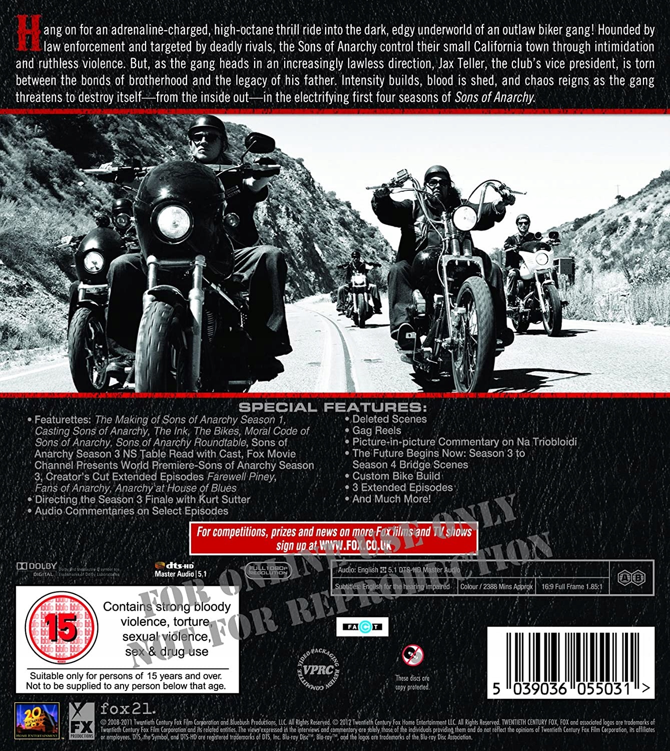 Blu-ray/Великобритания/регион Все актуальные. Комплект из 12 дисков. Пройдите 1-4 сезоны популярного американского байкерского драматического сериала. Возглавляемый Клэем Морроу (Рон Перлман), мотоклуб преступников «Сыны анархии» осуществляет мафиозную власть над небольшим городком Чарминг в Северной Калифорнии. Банде приходится иметь дело с угрозами своему авторитету, а также с внутренней напряженностью, например, с постоянно растущими сомнениями заместителя лидера Джакса (Чарли Ханнэм) относительно роли банды в городе. Эпизоды первого сезона: «Пилот», «Семена», «Веселый город», «Заплатка», «Возврат», «АК-51», «Старые кости», «Притяжение», «Ад последовал», Лучшая половина», «Капибара», «Сон младенцев» и «Откровение». Эпизоды 2 сезона: «Альбификация», «Маленькие слезы», «Исправление», «Эврика», «Порази», «Falx Cerebri», «Галаад», «Потлач», «Фа Гуан», «Бальзам», «Служба». ', 'Отбраковка' и 'На триоблоиди'. Эпизоды третьего сезона: «Итак», «Смазанный», «Секутор», «Дом», «Поворот и поворот», «Толчок», «Расширяющийся круговорот», «Лочан Мор», «Турас», «Фиринн». «Бейн», «Июньская свадьба» и «НС». Эпизоды 4 сезона: «На выходе», «Бустер», «Дорилус», «Уна Вента», «Кирпич», «С крестиком», «Фрукты для ворон», «Семейный рецепт», «Поцелуй», «Руки». , «Call of Duty», «Сожженные и очищенные», «Быть, акт 1» и «Быть, акт 2».