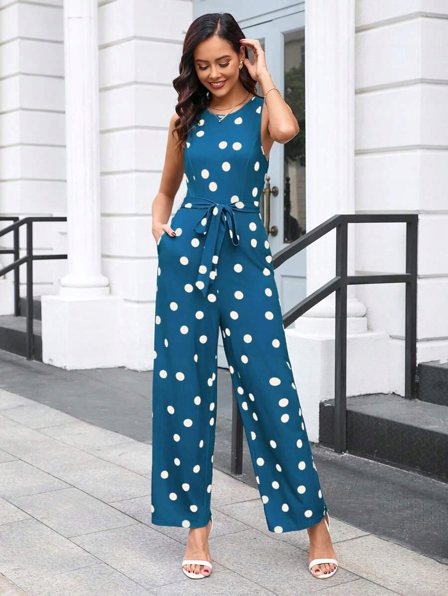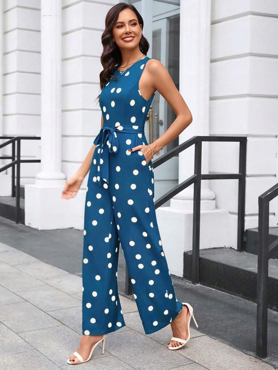 Синий комбинезон с белыми точками длинные брюки, связывающие салон