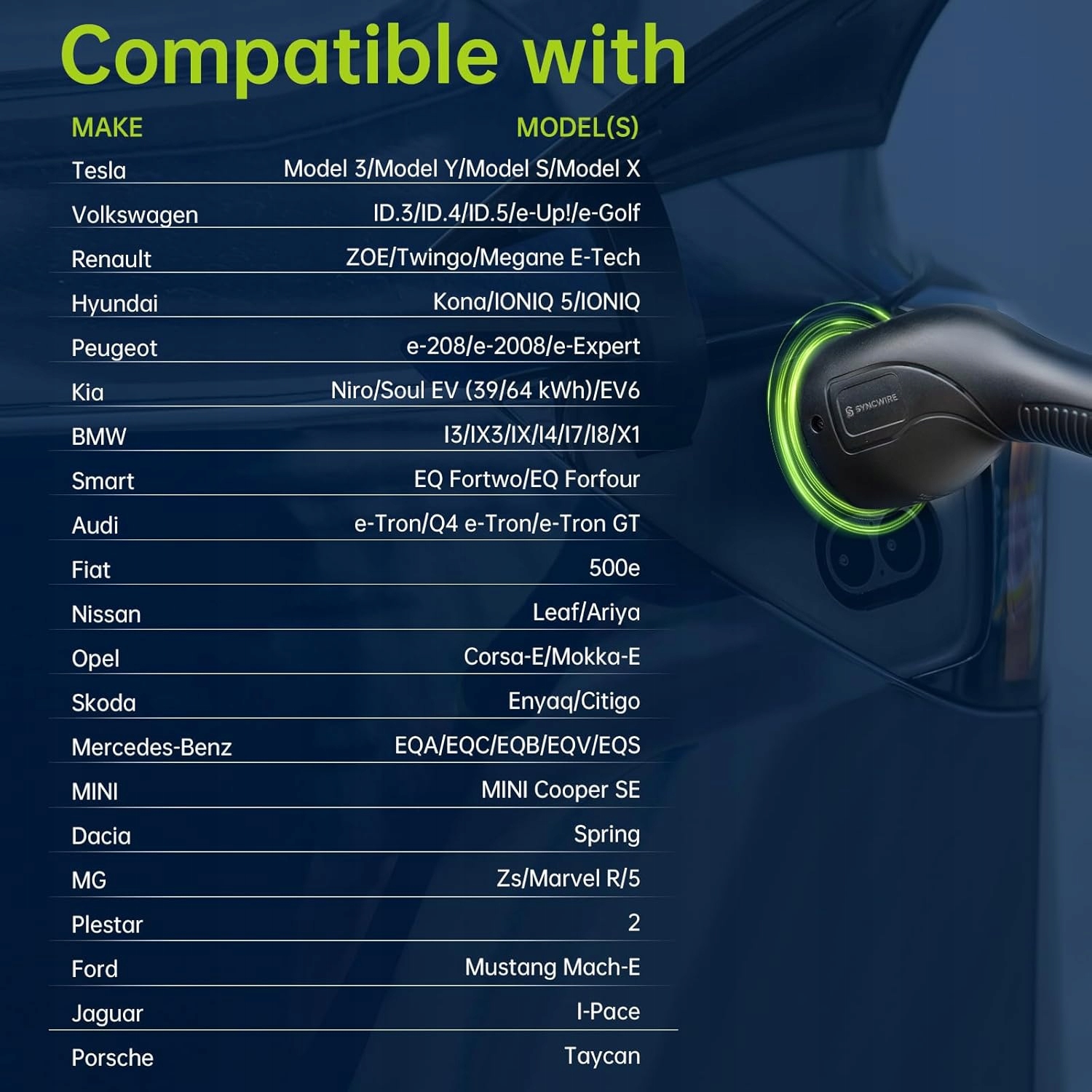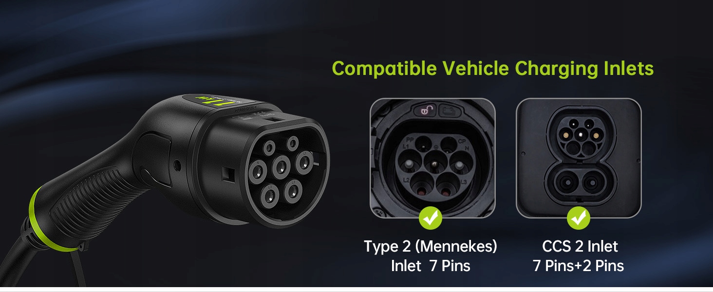 Широкая совместимость: EV Syncwire IEC 62196-2 Тип 2 к типу 2 Кабель зарядки 2 и гнездам с подключаемыми модулями с гнездами нагрузки типа 2 и CCS2, включая S/3/X/Y, I3, I4, IX3, ID.3, ID. Электрический, лист (40 кВтч), E-208, Ioniq 5, E-Niro, Enyaq IV, Taycan и не только. Он не совместим с розетками типа 1, CCS1, Chademo и GB/T зарядки.