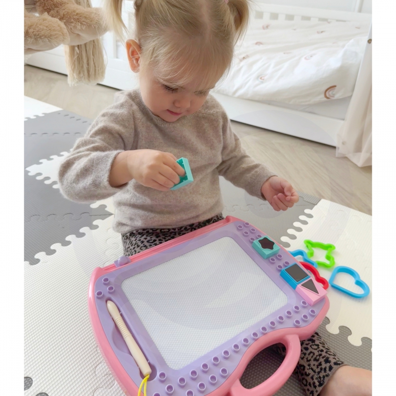 Магнитная доска дает возможность долго и творчески развлекать! Доска побуждает писать и рисовать. Рисование поможет сконцентрироваться, успокоиться и успокоить ребенка. Альбом позволяет создавать бесконечное количество картинок – просто переместите специальный ползунок, и рисунок исчезнет, и вы сможете рисовать снова! В набор дополнительно входит удобная волшебная ручка, 4 штампа и 4 узора, которые разнообразят работу. Доска имеет удобную ручку, поэтому ребенок сможет брать ее куда угодно. Описание разовьет у вашего ребенка мануальные навыки, воображение, творческие способности и даст вам возможность развить художественную сторону ребенка!