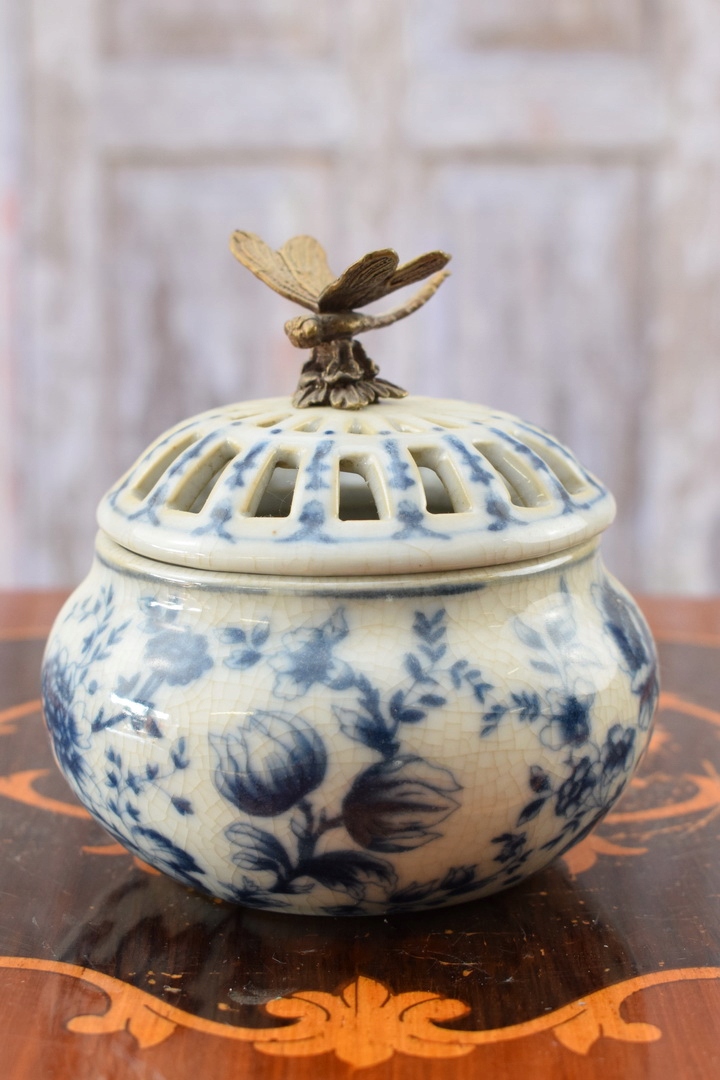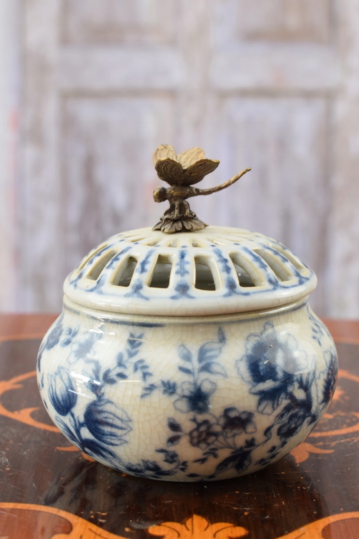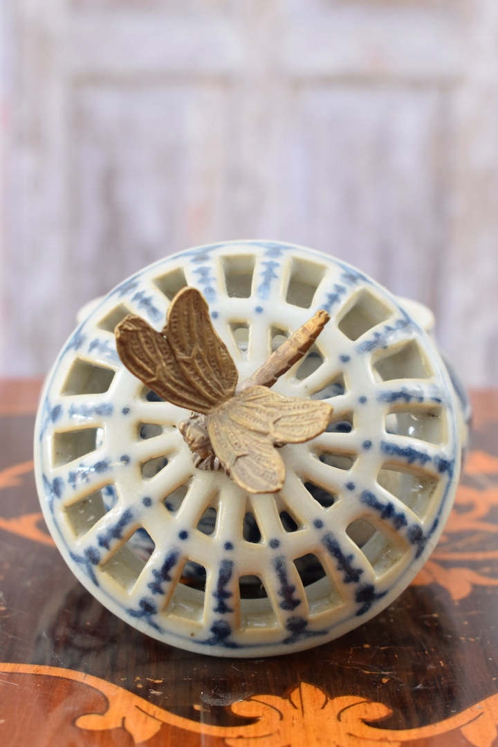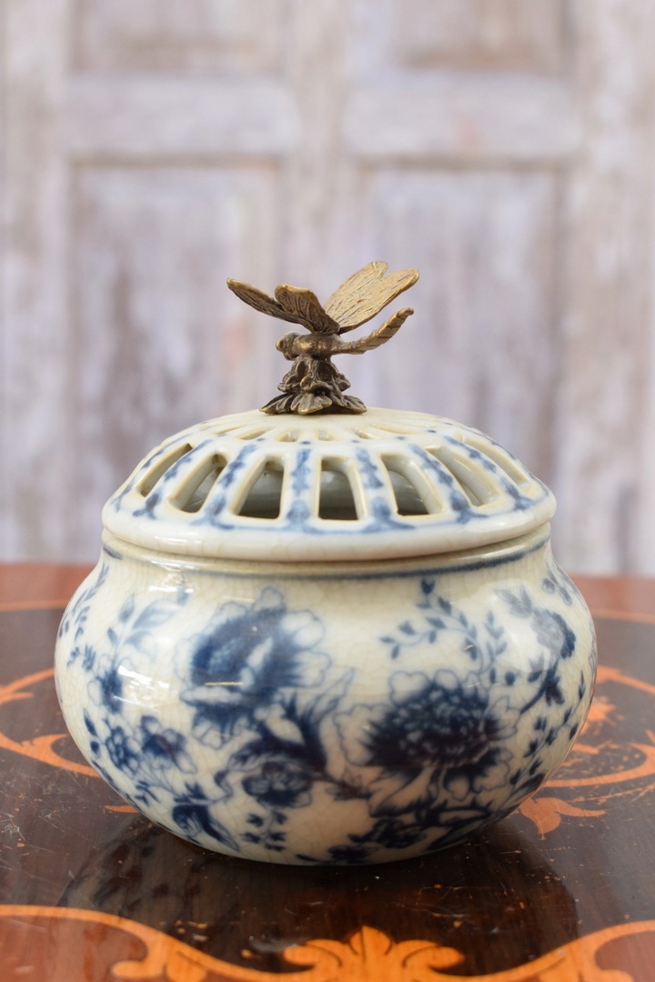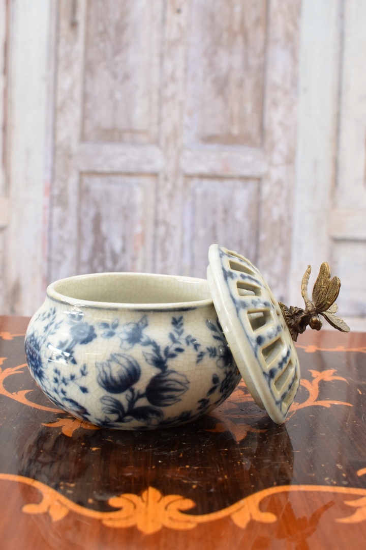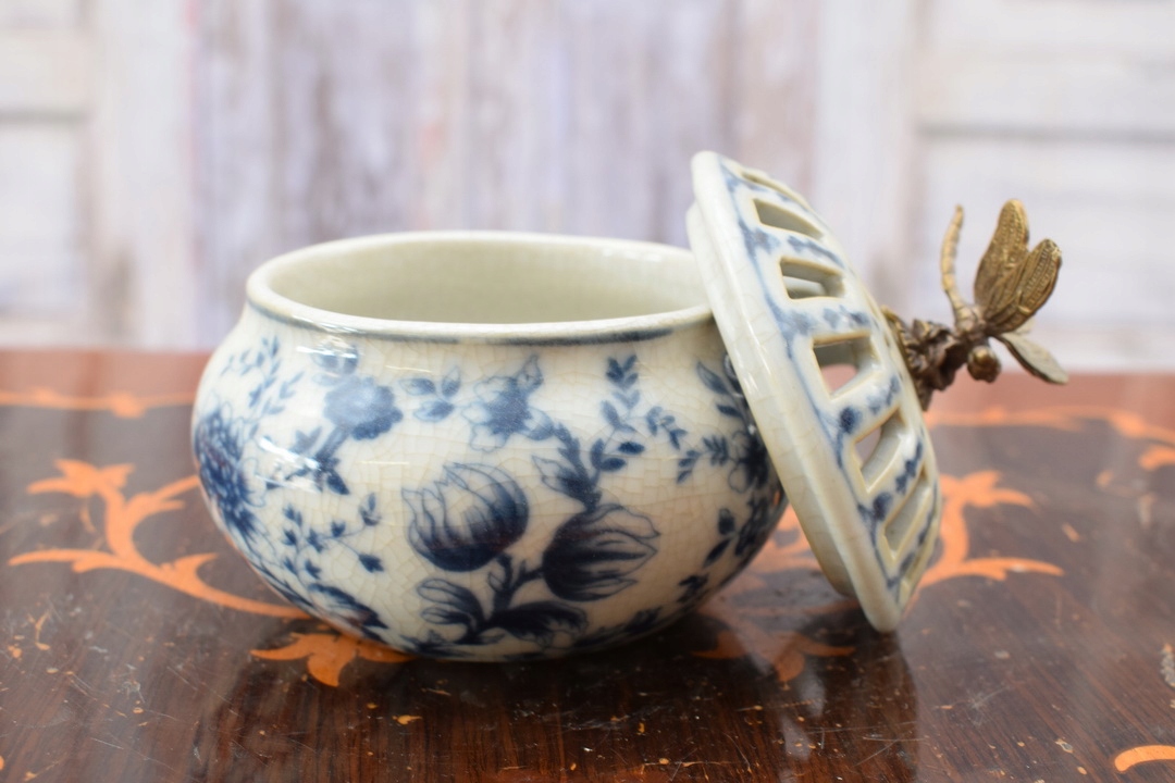 Синя бомбоньєрка, розписана чудова порцеляна + бронзова бабка