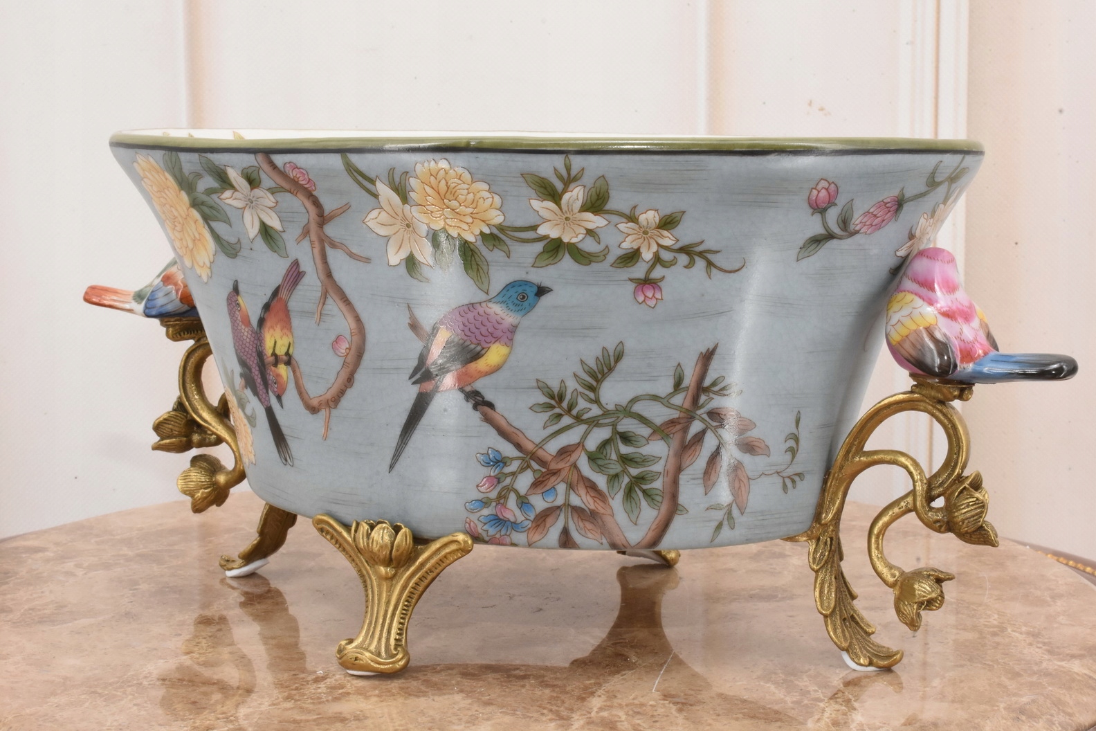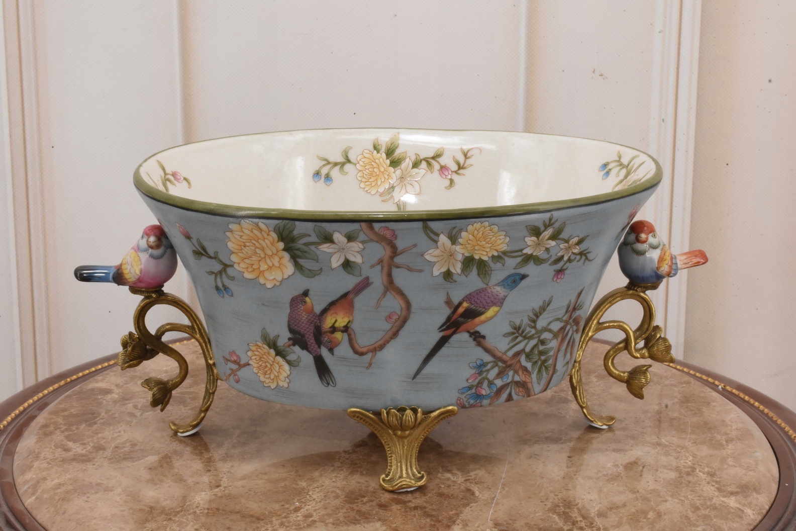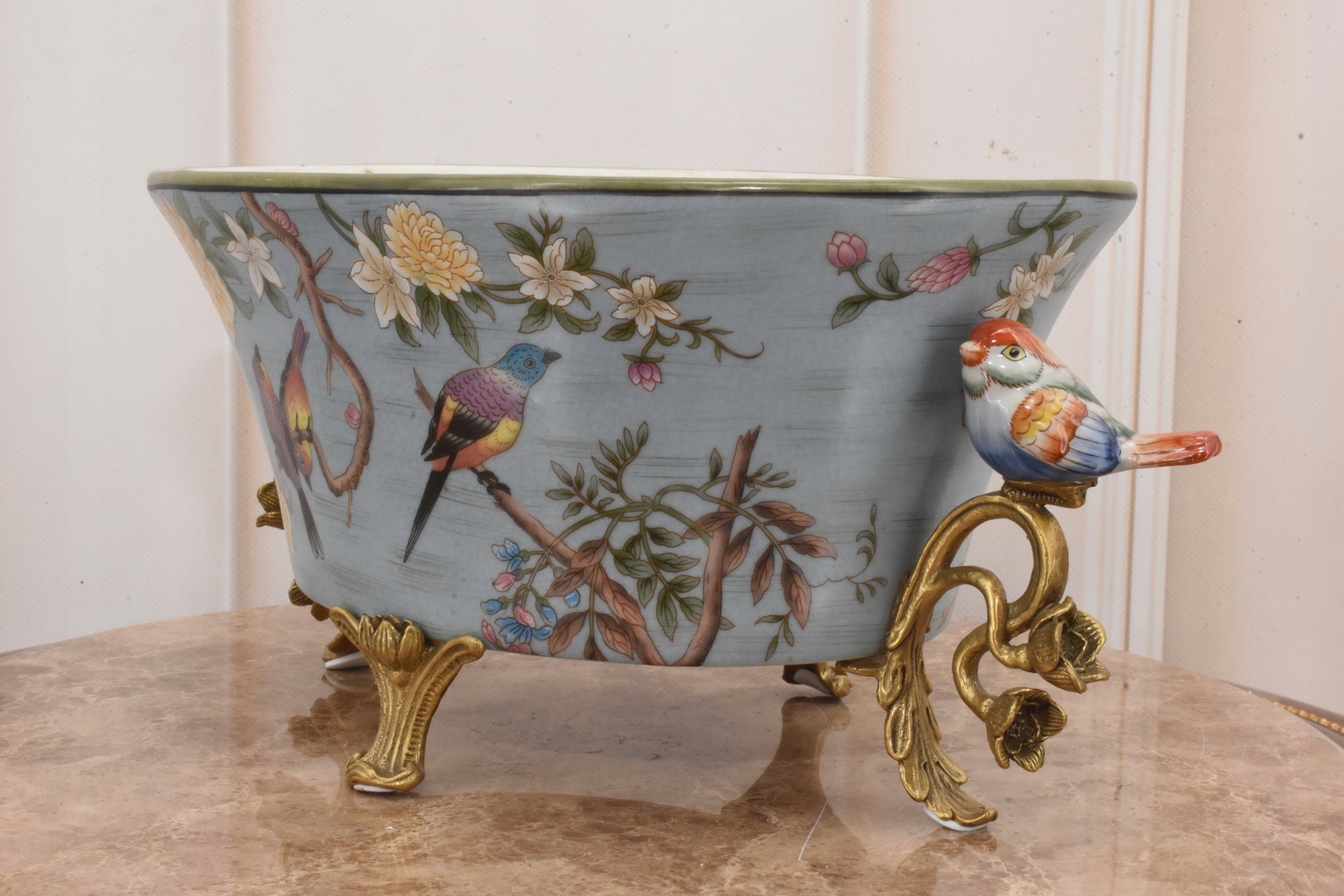 Синяя фарфоровая ваза чаша - красочные птицы - подписано - украшение