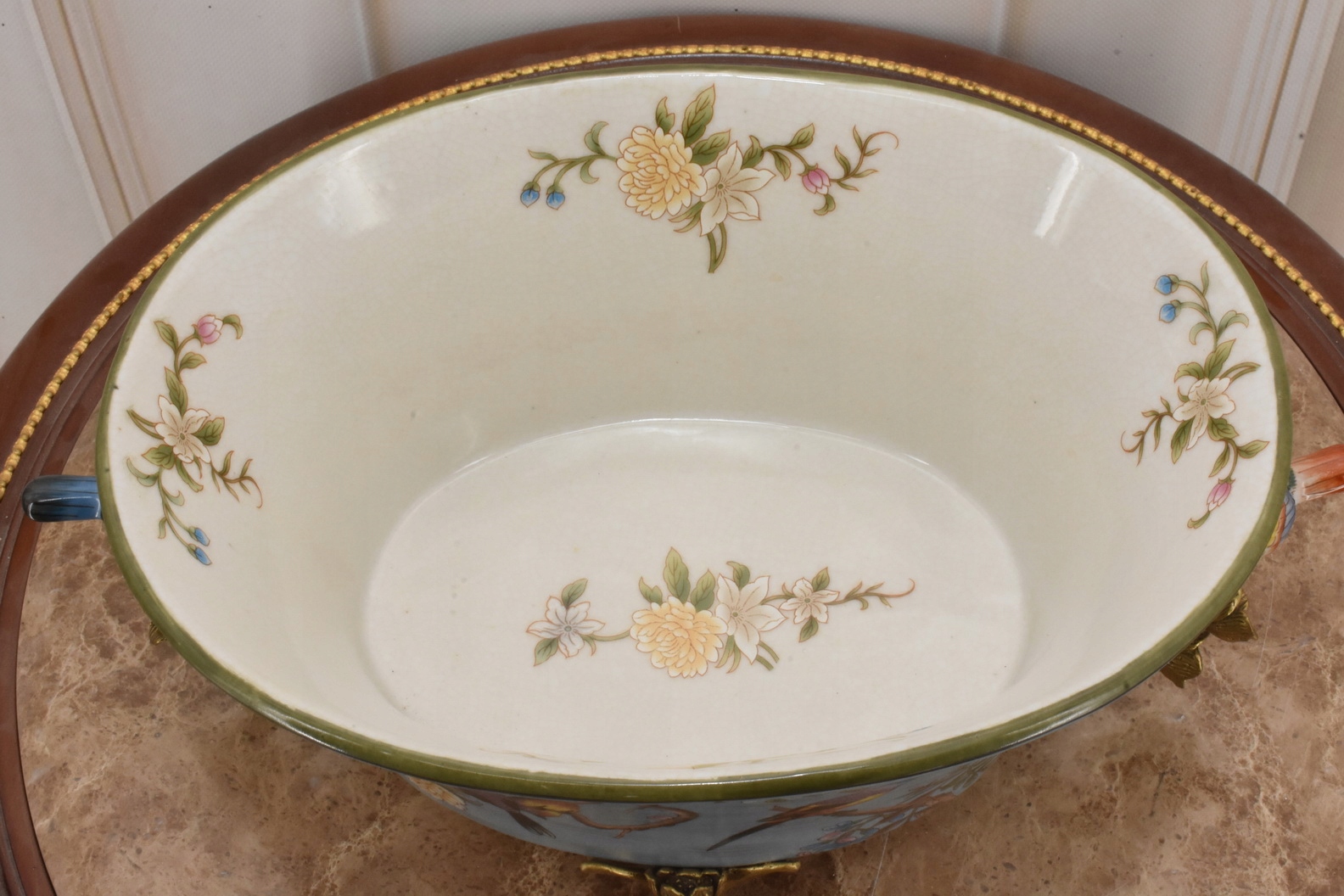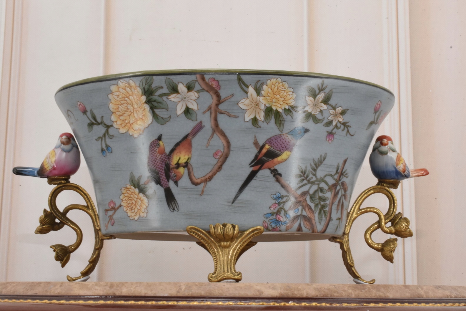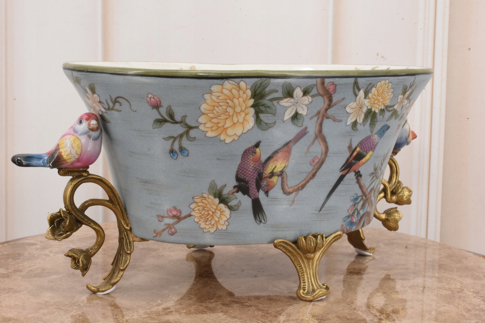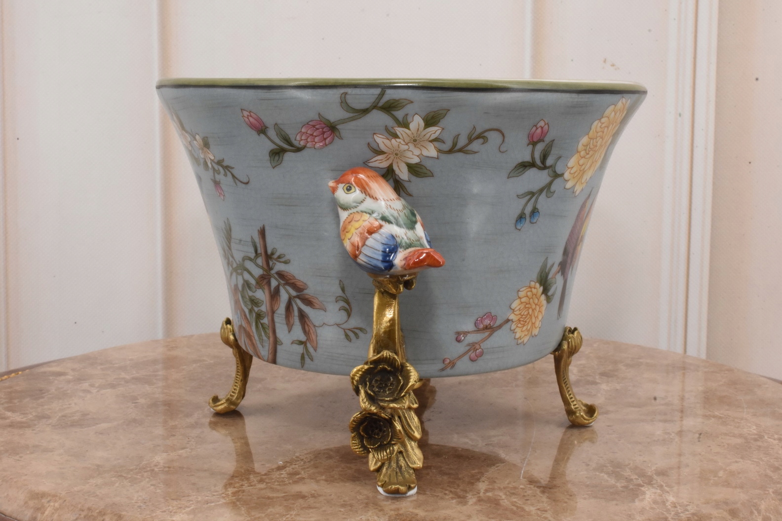 Синяя фарфоровая ваза чаша - красочные птицы - подписано - украшение