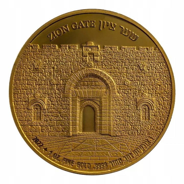 Zion Gate 1 oz Gold 2022 Proof — 7-я монета из серии «Ворота Иерусалима», на которой изображены «Ворота Сиона» — еще одни из ворот в стенах Старого города Иерусалима, построенные по заказу. султана Сулеймана Великолепного в османский период XVI века. Они также известны как Ворота Давида, потому что расположены недалеко от гробницы царя Давида на горе Сион.