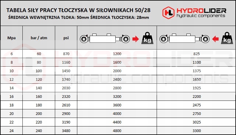 SIŁOWNIK TŁOK HYDRAULICZNY 2-STRONNY 50/28 SKOK 1000 L:1232