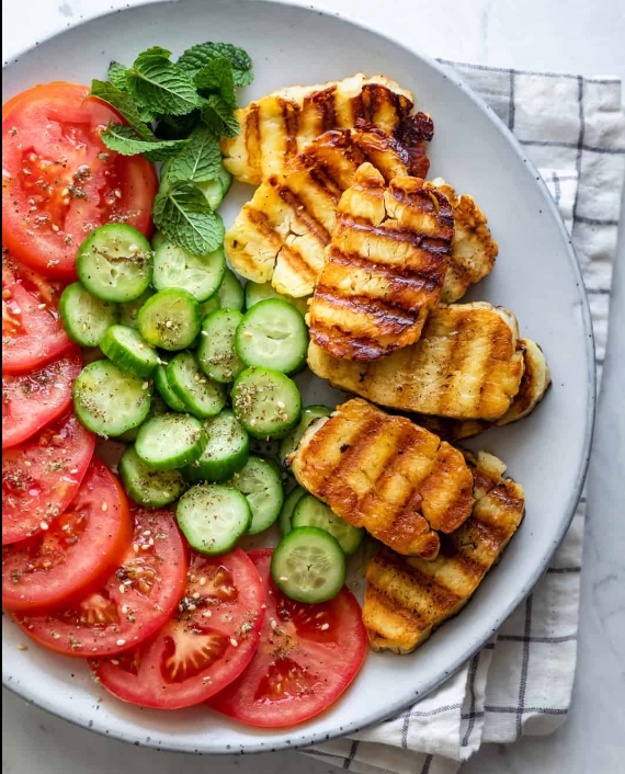 - Халлуми на гриле: Нарежьте сыр ломтиками толщиной примерно 1 см и обжарьте на среднем огне примерно 2–3 минуты с обеих сторон до появления золотистых полосок и полосок гриля. Подавайте с овощами, такими как жареный перец, цуккини или запеченный красный лук, а также с соусом на основе йогурта, чеснока и мяты.