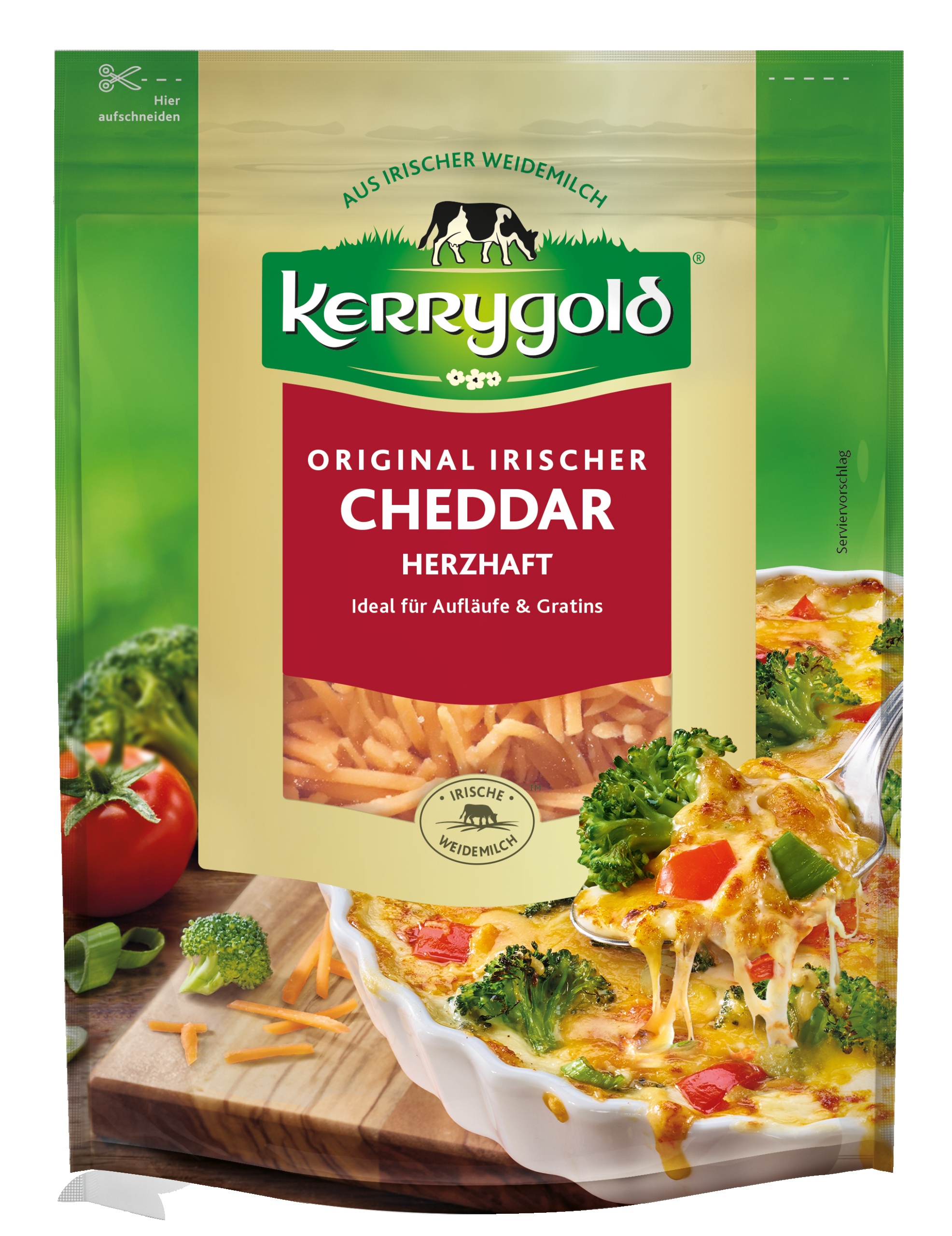 Оригинальный ирландский сыр Чеддер, тертый. Идеально подходит в качестве дополнения к запеченным блюдам. Благодаря своим идеальным свойствам плавления он обеспечивает красивую золотистую корочку, не теряя при этом характерного вкуса сыра чеддер. Его характерный оранжево-красный цвет обусловлен наличием природного пигмента бета-каротина. Обычно он созревает в течение 6 месяцев. Натурально, не содержит лактозы и подходит вегетарианцам.