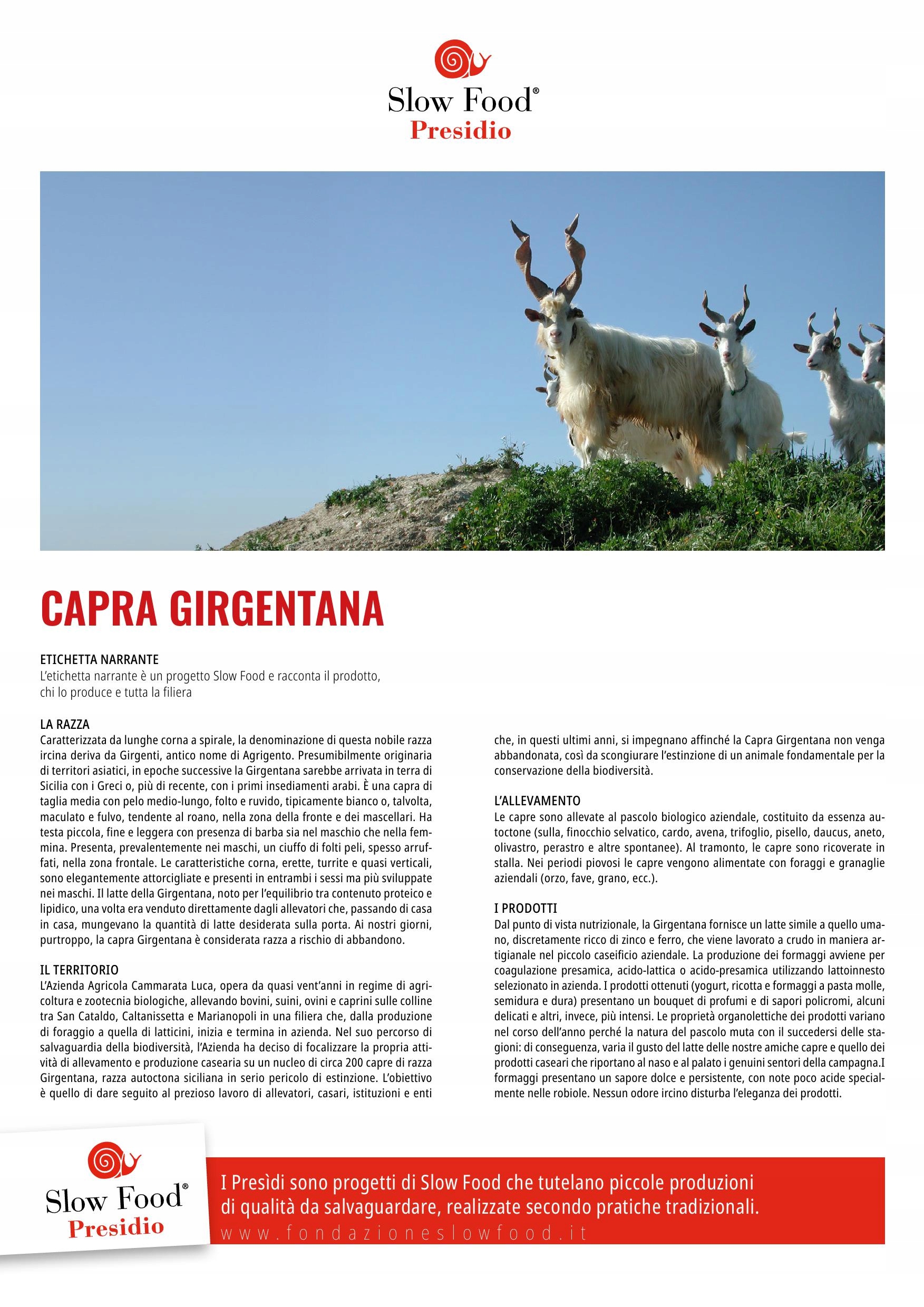 Органическая ферма Луки Каммарата является президиумом Слоу Фуд с козлом Гиргенто, имя которого происходит от города Гиргенти (ныне Агридженто). Их миссия — защитить это ценное генетическое наследие и производить высококачественные сыры, сохраняя при этом биоразнообразие и территорию. Признание Бюро Слоу Фуд является важной вехой в защите исчезающей породы.