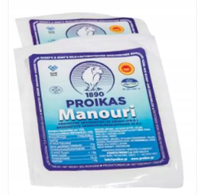 Традиционный свежий сывороточный сыр Манури, имеющий Защищенное наименование растительного происхождения, производится в основном в Центральной и Западной Македонии. Изготовлено из слитой сыворотки, состоящей из 70% овечьего молока и 30% козьего молока. Хорошо известен своим сладким мягким вкусом и ароматом. Он более сливочный и менее соленый, чем фета. Идеально подходит для салатов, выпечки, варки и выпечки, особенно для приготовления десертов. Украсит любой сырный стол.