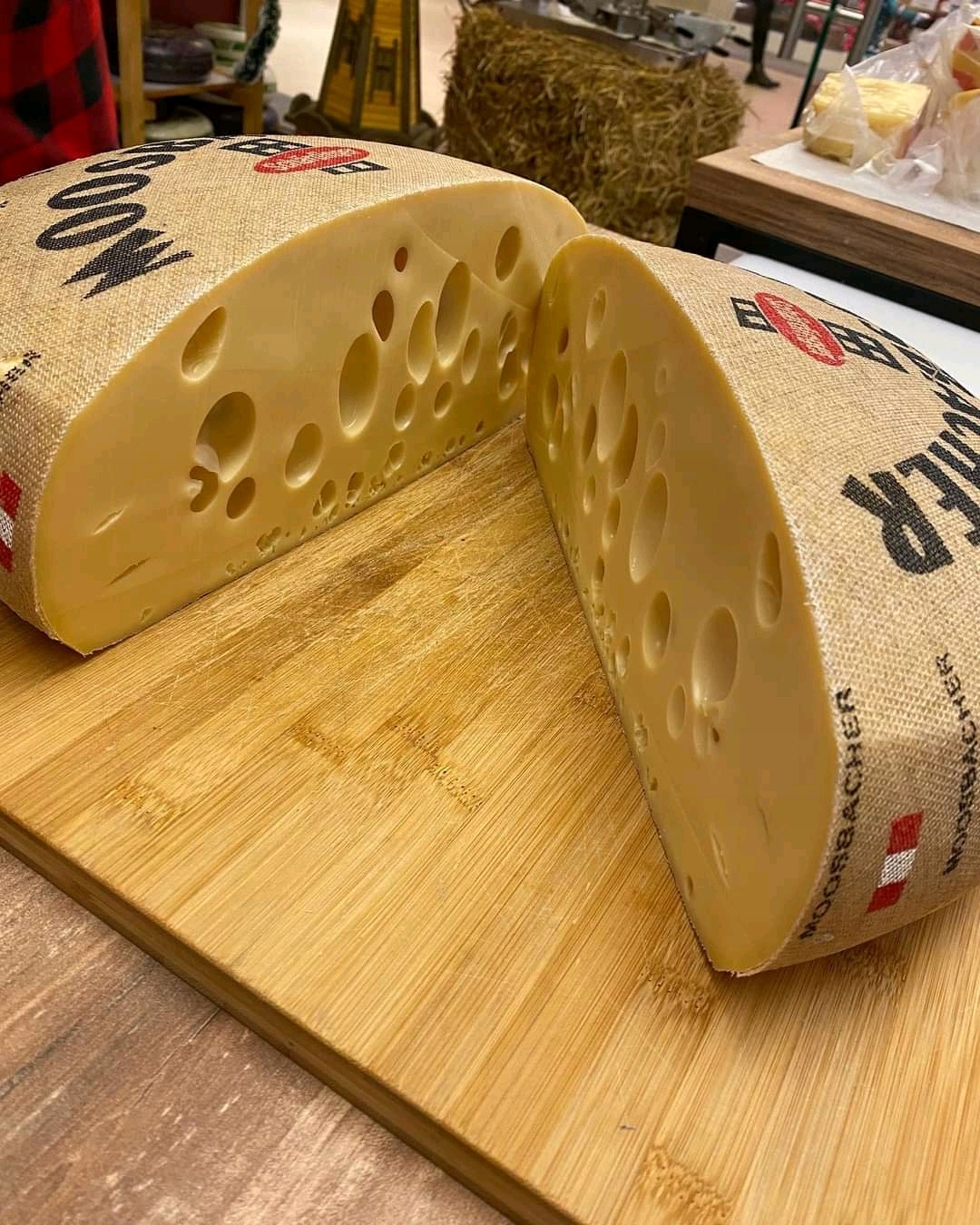 ▶️В австрийском стиле классический Моосбахер — единственный сыр, который имеет мытую кожуру и большие глазки благодаря двойному процессу созревания.