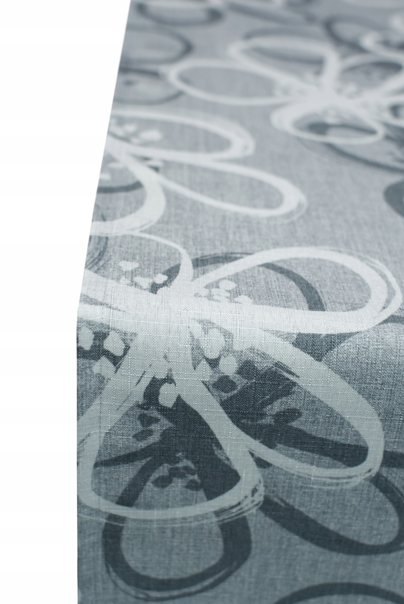 настольная дорожка с белыми и графитовыми стилизованными цветами на сером фоне.