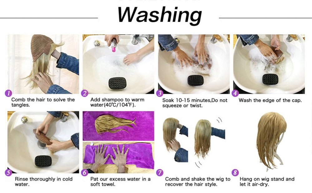 - Для очистки используйте небольшое количество мягкого шампуня в холодной или теплой воде, затем замочите парик примерно на 10–15 минут, аккуратно вытрите влагу с парика с помощью полотенце, не трите его слишком сильно и поместите на подставку для парика, пока оно не высохнет естественным путем. Вы также можете сушить его менее горячим воздухом из фена. Вы также можете использовать специальные средства по уходу за париками, чтобы дольше сохранять парики в хорошем состоянии