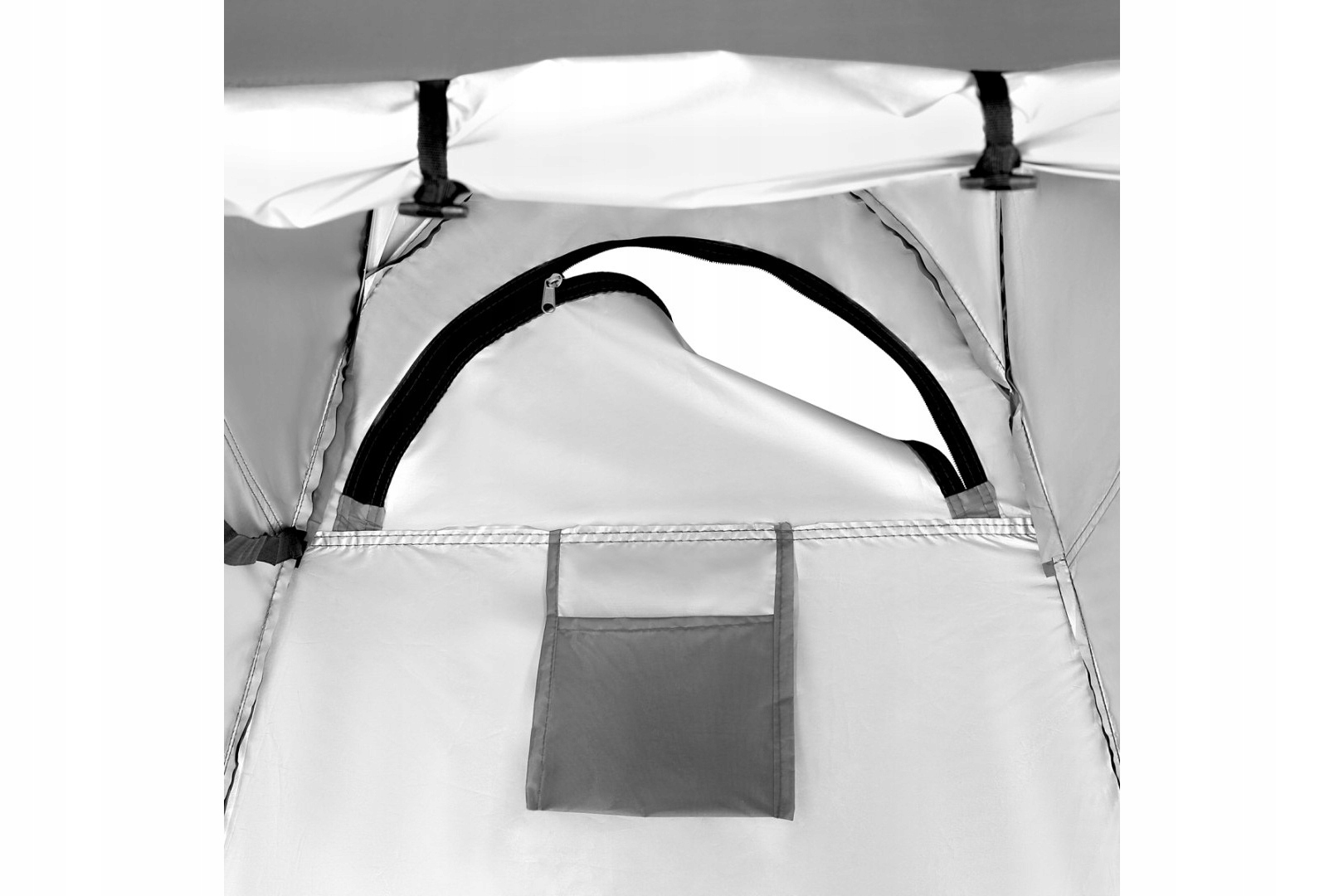 NC1706 оснащен широким входом, закрывающимся на молнию, которую можно удобно закатать. Дополнительно имеются два отверстия на молнии – боковое окно и отверстие в крыше, позволяющие, например, установить туристический душ. Внутри есть практичный карман для мелочей и ремень для подвешивания одежды или полотенца. Отсутствие пола повышает удобство использования в полевых условиях.