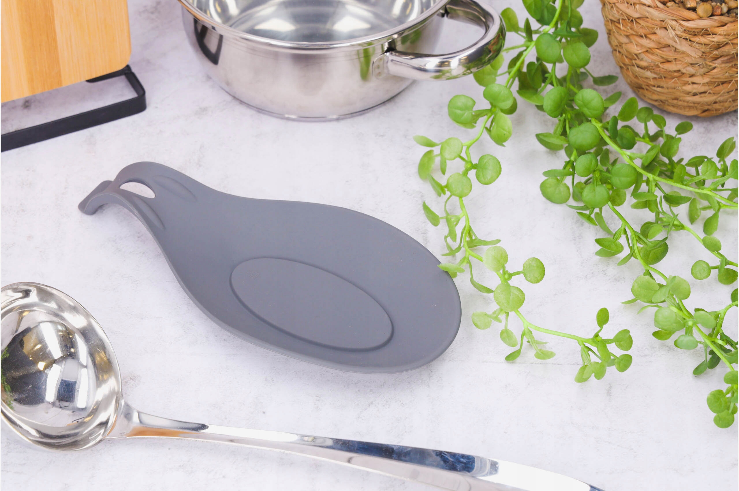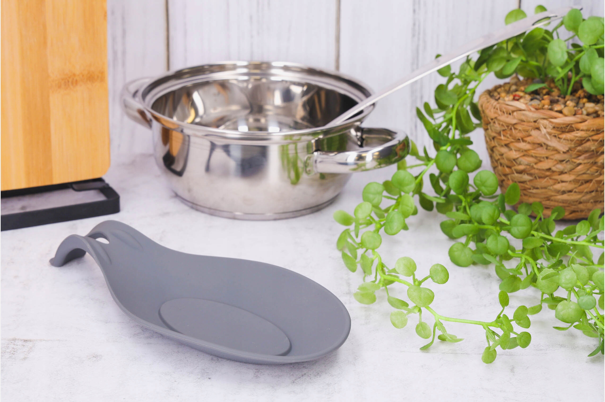 Сіра силіконова підставка для ложки захищає стільницю та стіл від бруду