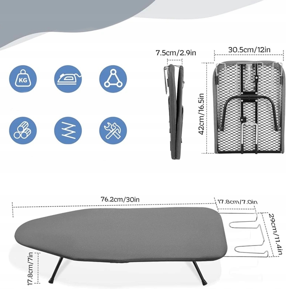 - Эта небольшая настольная гладильная доска размером 76,2 x 29 x 17,8 см в разложенном виде позволяет легко гладить рубашки, длинные юбки, брюки и другую одежду.
