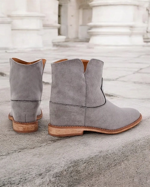 Классические ковбойские ботинки на крытом клине из серого цвета эко-эко. Женская обувь имеет изоляцию меха. Сапоги - отличное дополнение к брюкам и платьям!