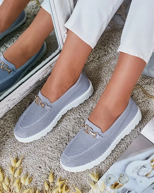 Удобные женские лоферы в стиле спортивного стиля. Верхняя изготовленная из материала из ткани, вставка также является тканью. Нос украшен золотым металлическим украшением цирконами. Они будут отличным украшением для повседневных стилей
