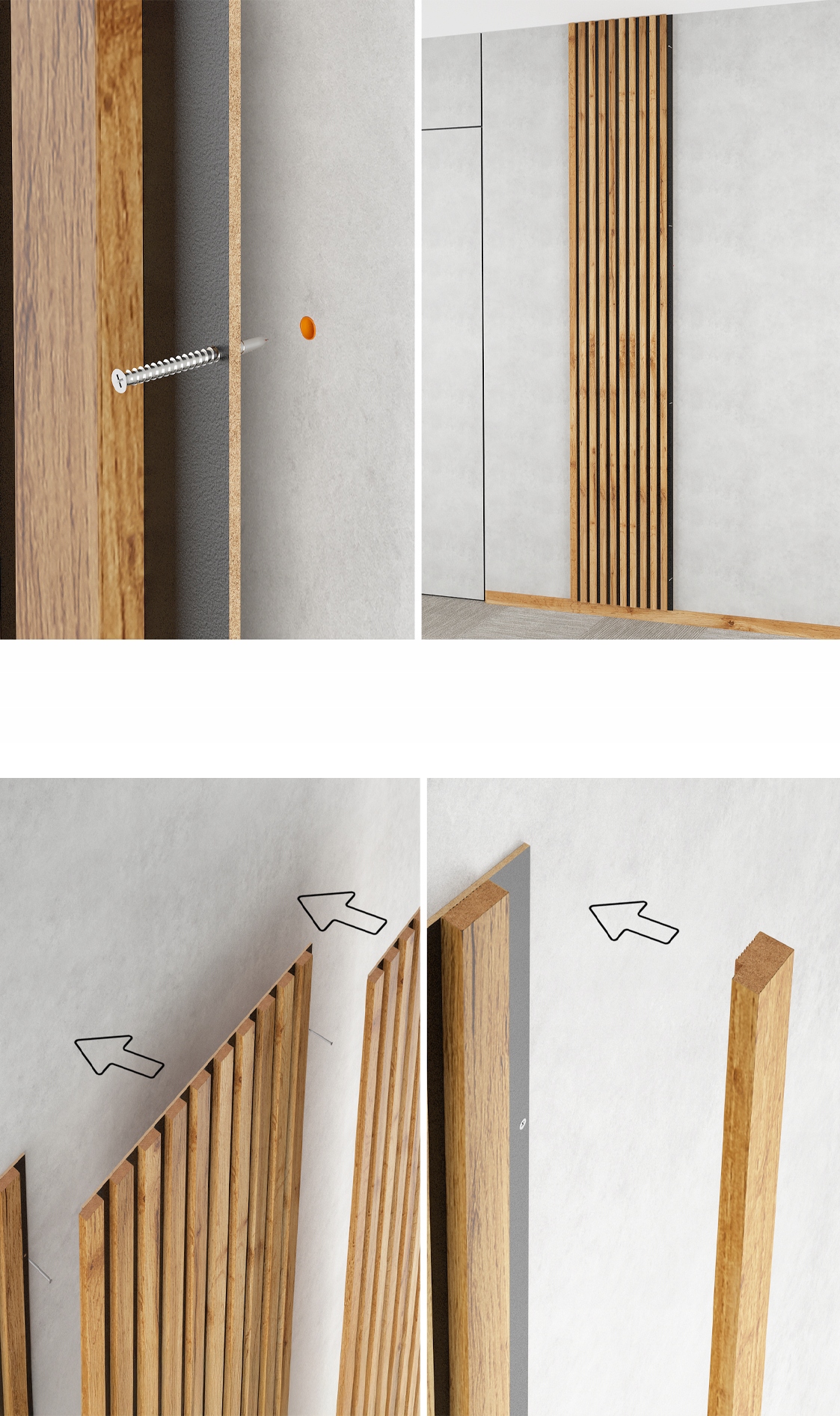 Склейте ламеллы к стене, прижимая их к стене по всему доверию. Приклейте панель так, чтобы отверстия в HDF с монтажными заглушками покрыты.