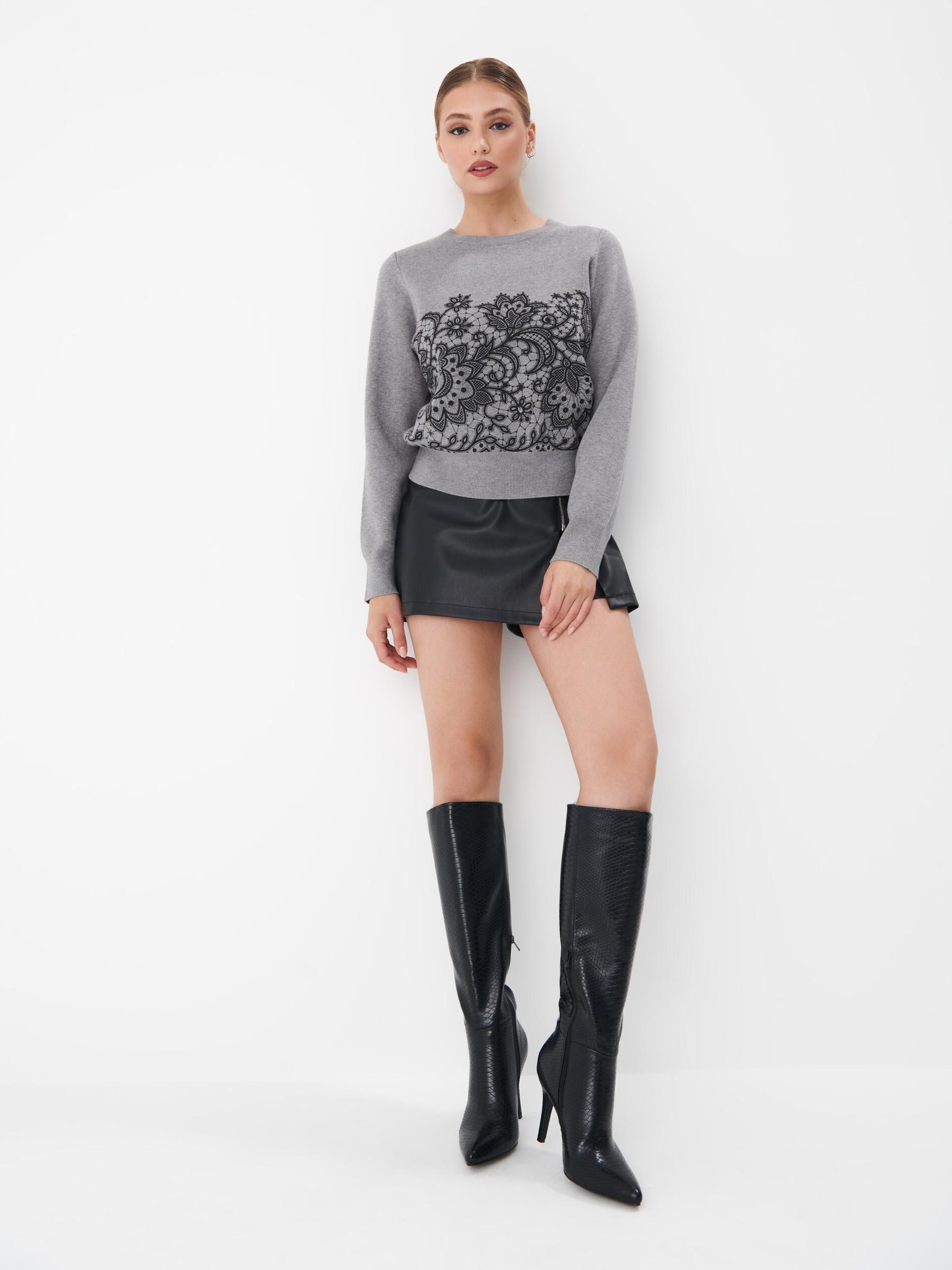 Серый классический рисунок свитера с длинным рукавом. Круглый вырез могито