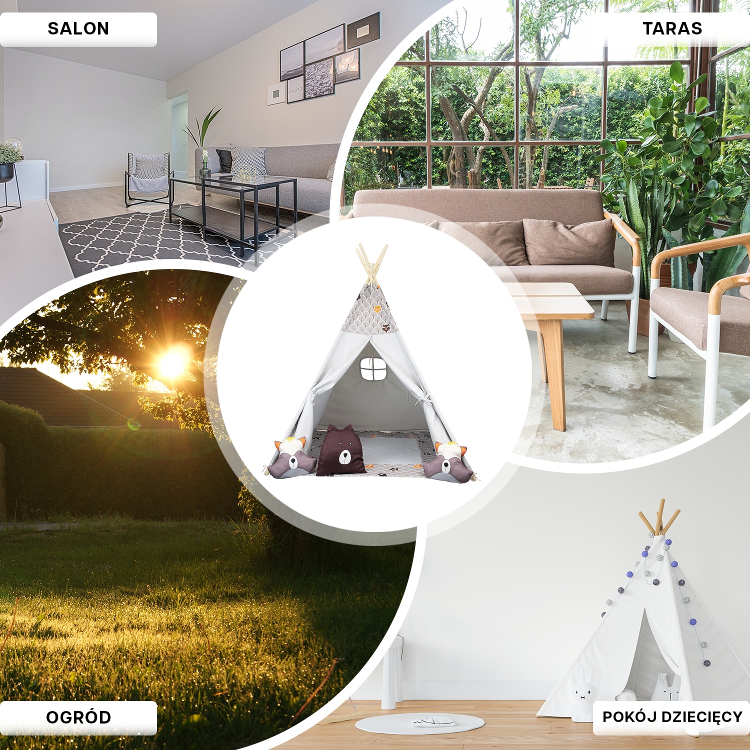 Качественная палатка-вигвам для детей, с комплектом подушек и окном. Типи выполнен в современном стиле, поэтому понравится играть каждому ребенку. Он изготовлен из материалов высочайшего качества, что делает его безопасным для детей. При этом здесь нет выступающих и острых элементов, которые могли бы навредить ребенку. Благодаря своим размерам вигвам позволяет свободно играть или обеспечивает достаточно места для приятного отдыха и, самое главное, место для большого количества игрушек. Палатка имеет каркас из высококачественной древесины, что обеспечивает устойчивость всей конструкции. Чехол изготовлен из материала, который гарантирует долговечность изделия.