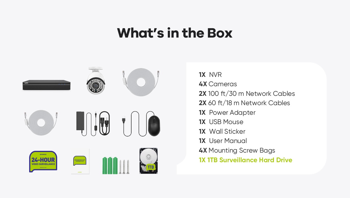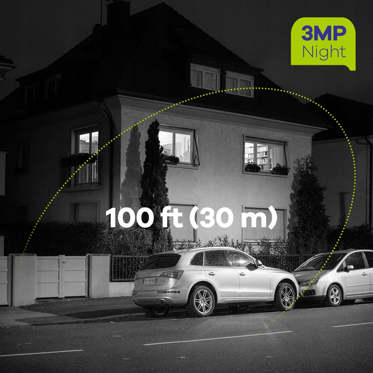 до 100 -футового ночного обзора с 36 встроенными ИК -светодиодами до 10oft. Устройство ночного видения вводится в глазах даже в условиях плохого освещения. Кроме того, интеллектуальная ИК -технология уравновешивает освещение, чтобы избежать проблем с чрезмерной экспозицией.